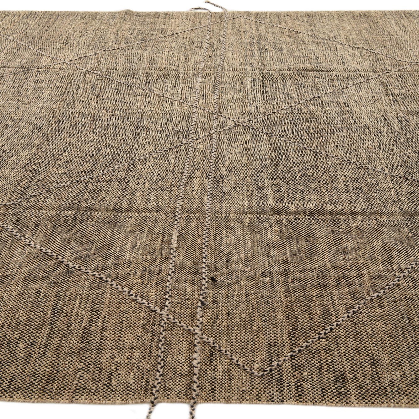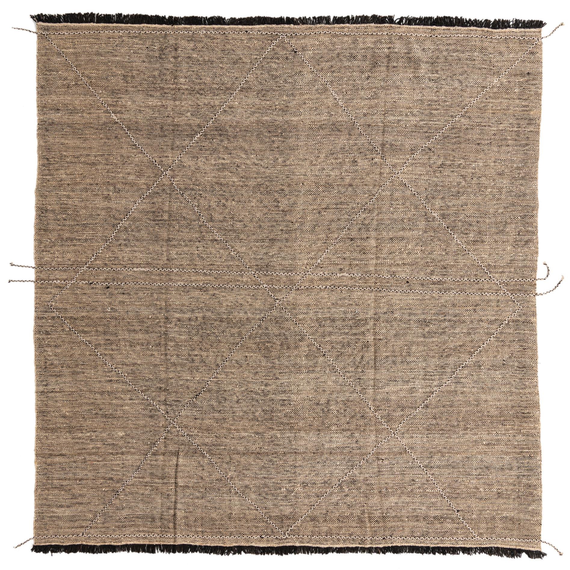 This 9 Ft Square Moroccan Collection rug is hand-knotted of 100% wool, offering a durable and timeless addition to any interior. The rug features a natural background color accented by geometric patterns and motifs in shades of brown. The simplicity of the design allows for versatility in styling, with clean lines that lend a structured yet organic feel to the piece.