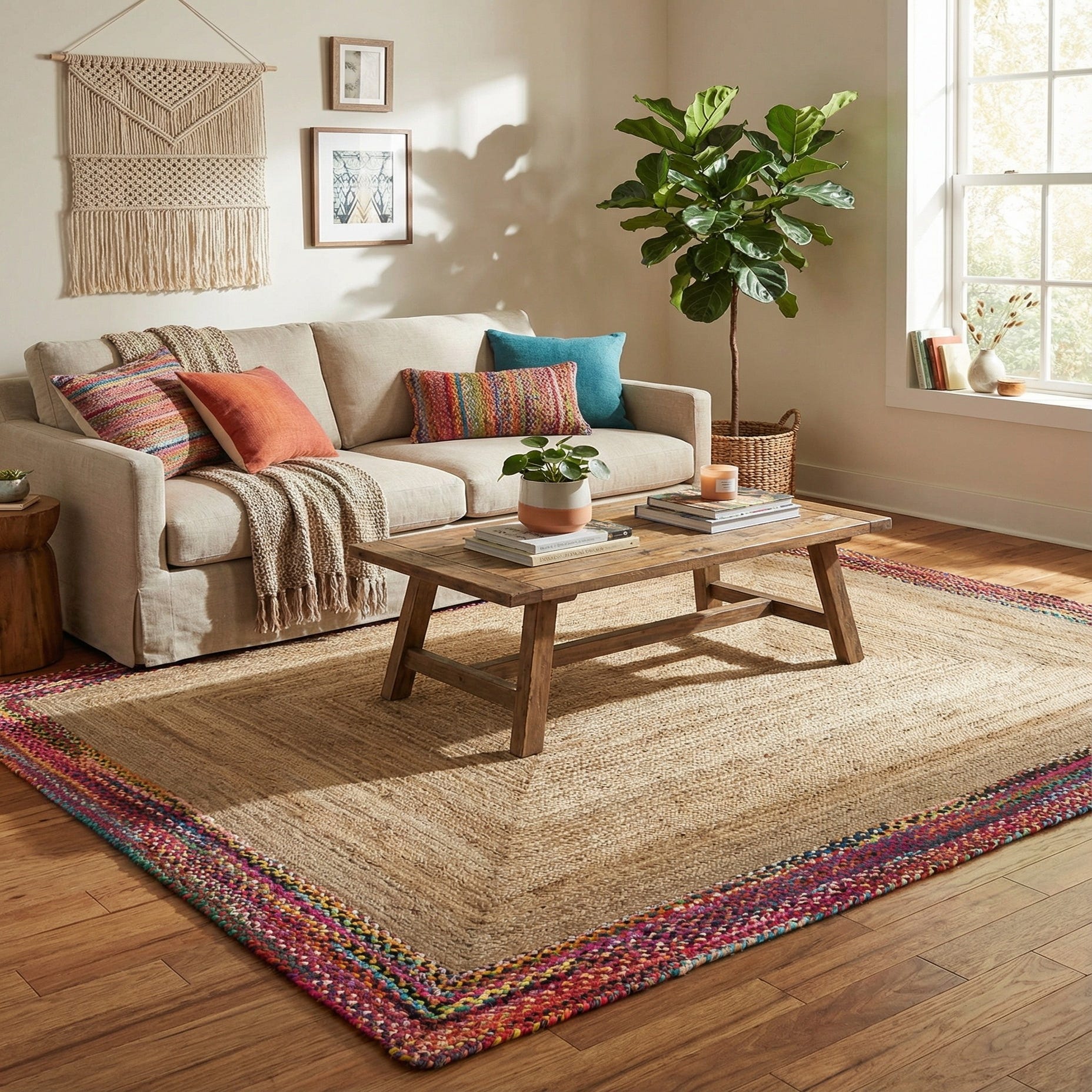 A 9x12 rectangular natural jute rug with a minimalist solid brown center and a vibrant, multicolored braided cotton border.