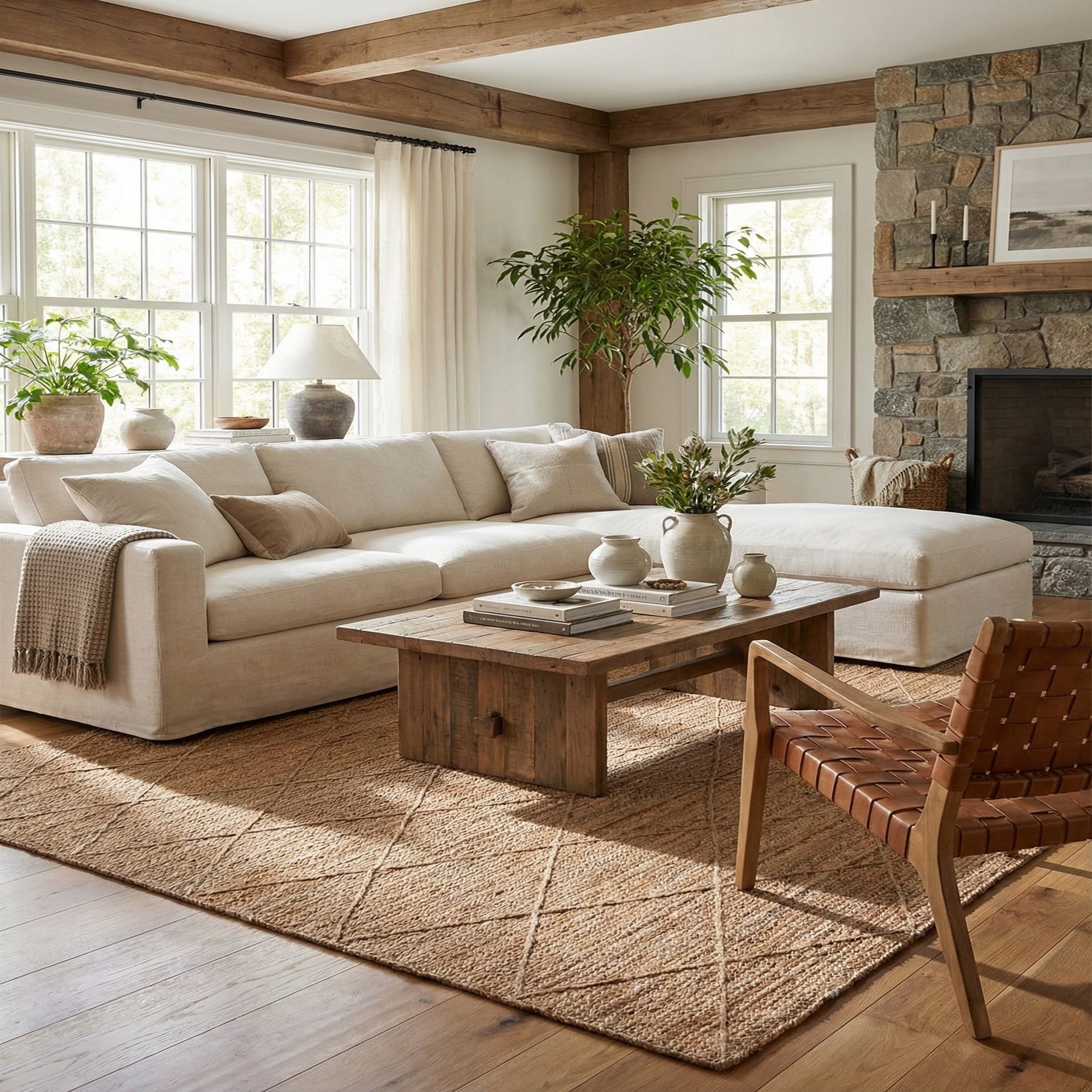 This rug fits well in relaxed, natural interiors — think coastal and farmhouse settings, sunlit living rooms, or a casual dining area with wooden furnishings. It also pairs nicely with rattan or leather pieces, neutral linens, and layered textiles for a modern bohemian look. Use it to ground a seating arrangement, anchor a dining table, or add texture to an entry or sunroom where an earthy, understated foundation is desired.