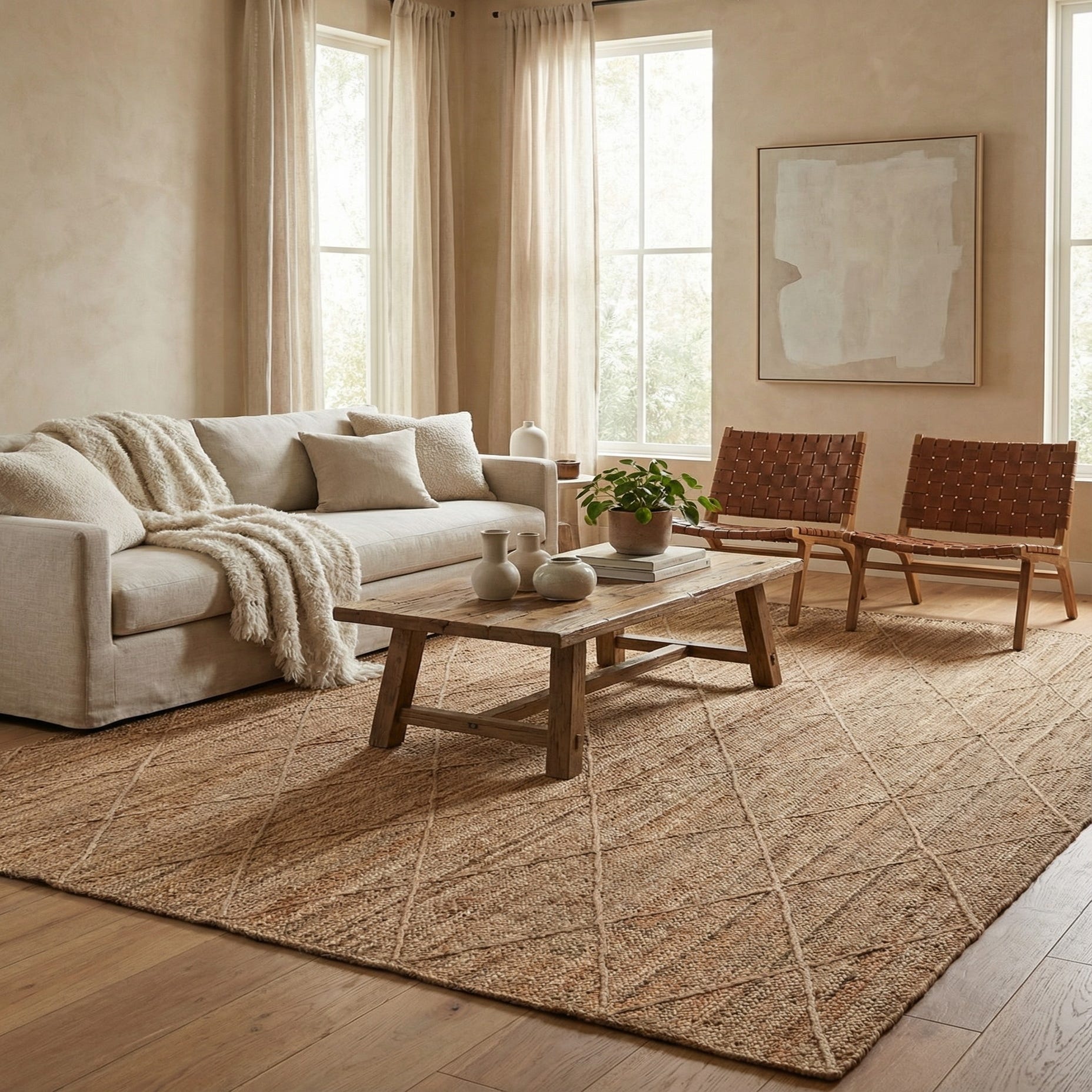A 9x12 rectangular natural jute rug with a braided texture and subtle diamond pattern, ideal for a living room.