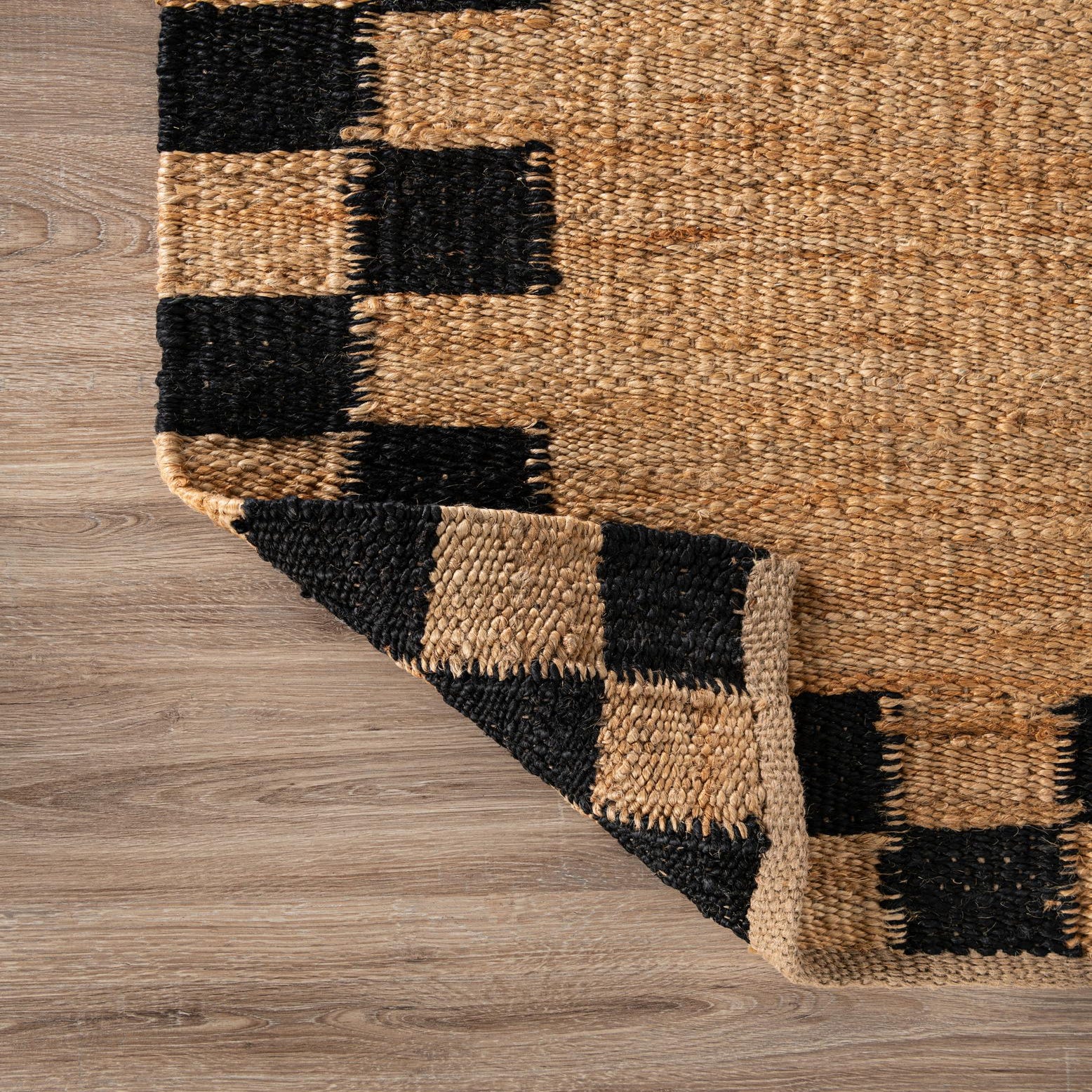 A natural jute runner rug with a bold black and natural checkered border, perfect for a hallway or kitchen.