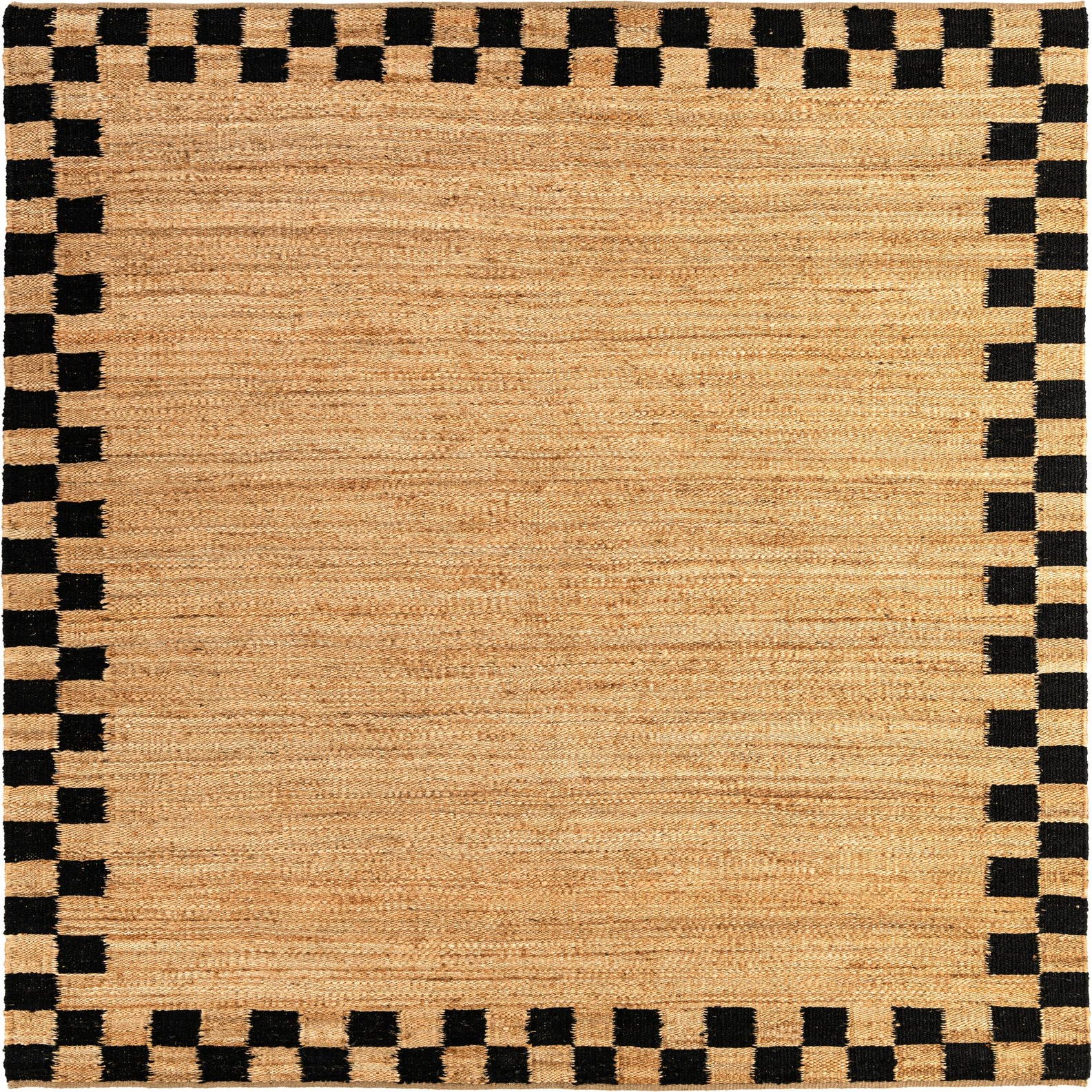 A rectangular 8x10 natural jute area rug with a bold black checkerboard border, suitable for a living room or bedroom.