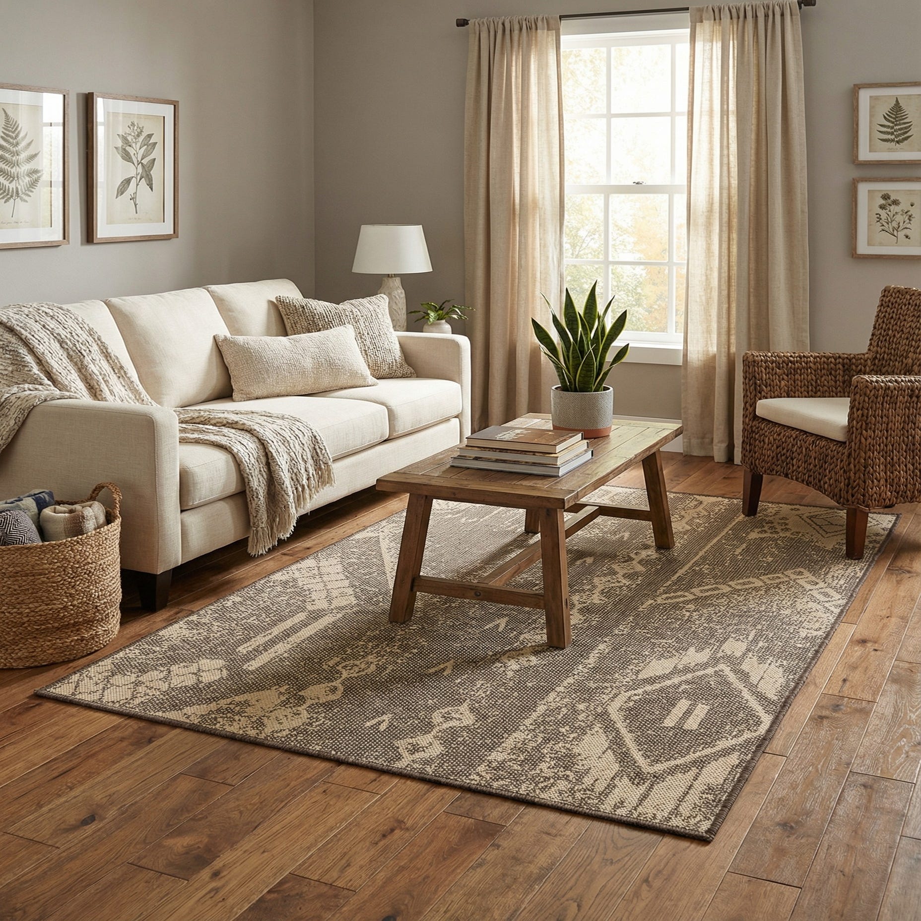 Machine-made from polypropylene, the rug has a low-profile, tightly woven surface that feels slightly textured underhand—enough to register beneath bare feet yet thin enough to layer under furniture. It’s well suited for everyday spaces: place it beneath a coffee table in a casual living room, anchor a cozy reading nook, run it down a hallway, or use it under a dining table to add pattern without bulk. The neutral colorway and faded motif also work nicely in farmhouse, modern rustic, or contemporary minimalist interiors.