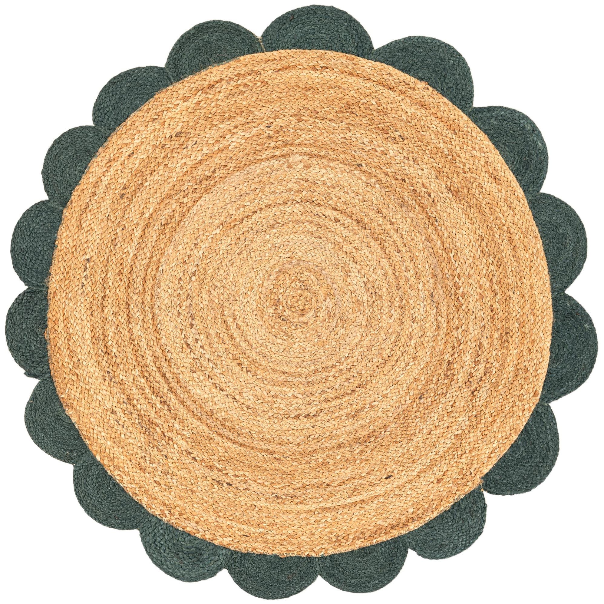A 4' 1 x 4' 1 round jute rug with a natural brown braided center and a dark green scalloped border.