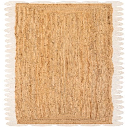Hand-braided from 100% jute, this runner pairs a clean, linear center with a scalloped ivory edge for a quietly distinctive look. The natural jute field has warm, honeyed tones and subtle flecks that create gentle variation across the surface, while the layered rectangular braid at the center adds low-profile pattern and structure. Running your hand across it, you’ll notice the tactile braided texture—firm underfoot with a pleasant, organic feel that brings a natural element into the room.