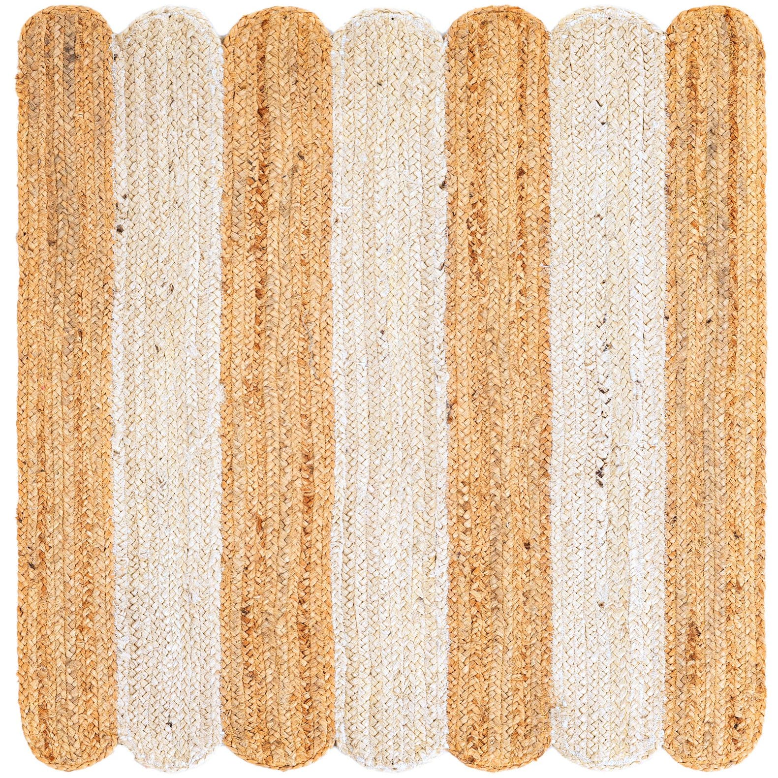 Hand-braided from 100% jute, this scallop-edged rug pairs broad, alternating stripes of Natural and Ivory with a softly rounded silhouette for an understated, textural look. The braided construction creates a low-profile surface with a firm, tactile weave you can feel beneath your feet; natural fiber variations and subtle color shifts add depth without fuss. The scalloped edge gives the piece a handcrafted character that complements both casual and more composed spaces.