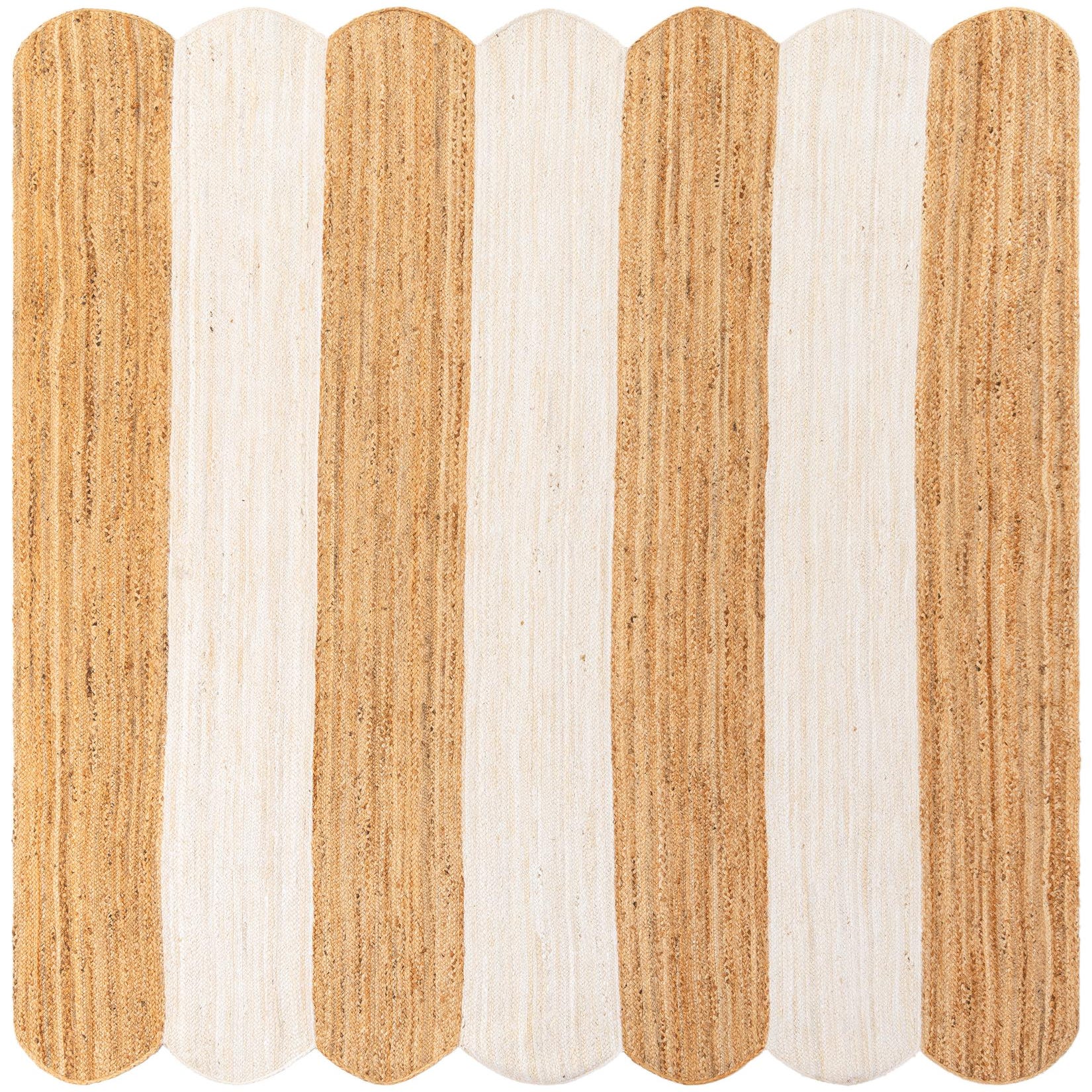 Scalloped edges frame broad, alternating stripes of Natural and Ivory for a clean, relaxed look. Hand-braided from 100% jute, the bands reveal subtle tonal variation and visible braided ribbing that give the surface character. The rug feels low-profile and textured underfoot—firm with a natural, slightly coarse hand that brings an organic layer to a room without overwhelming it.