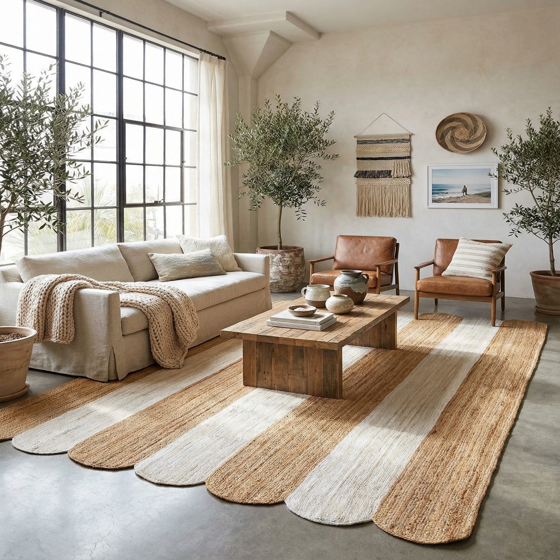 This rug works well in casual, light-filled spaces where natural materials set the tone — think a coastal living room layered with linen sofas, a farmhouse dining area anchored by a wooden table, or a sunroom with rattan chairs and woven accents. It also pairs nicely with Scandinavian and modern-boho interiors that favor simple shapes and textural contrast, bringing warmth and understated pattern without overwhelming the room.
