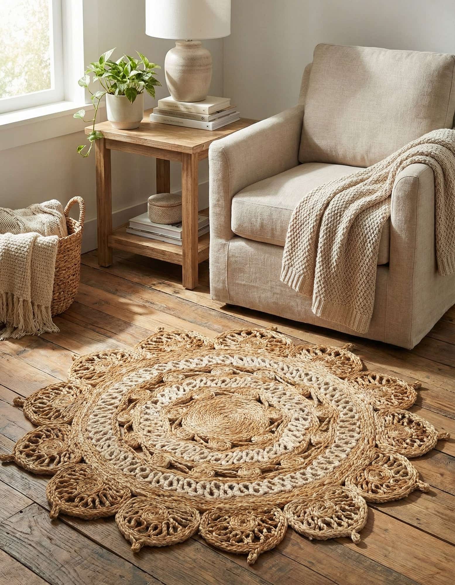The neutral palette and organic texture work well with casual, coastal, farmhouse, or bohemian interiors. Place it beneath a small round table, use it to define a cozy reading nook, or layer it over hardwood or a larger sisal rug for added dimension. It complements rattan and light wood furniture, linen upholstery, woven baskets, and plenty of greenery.