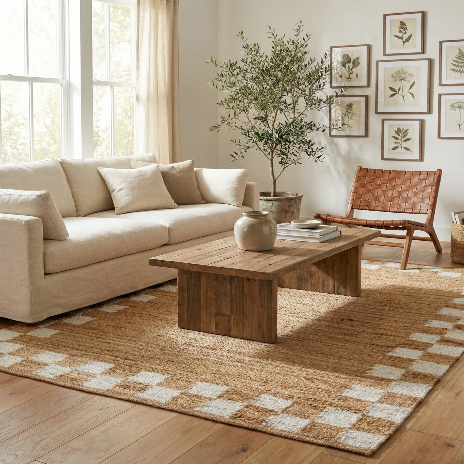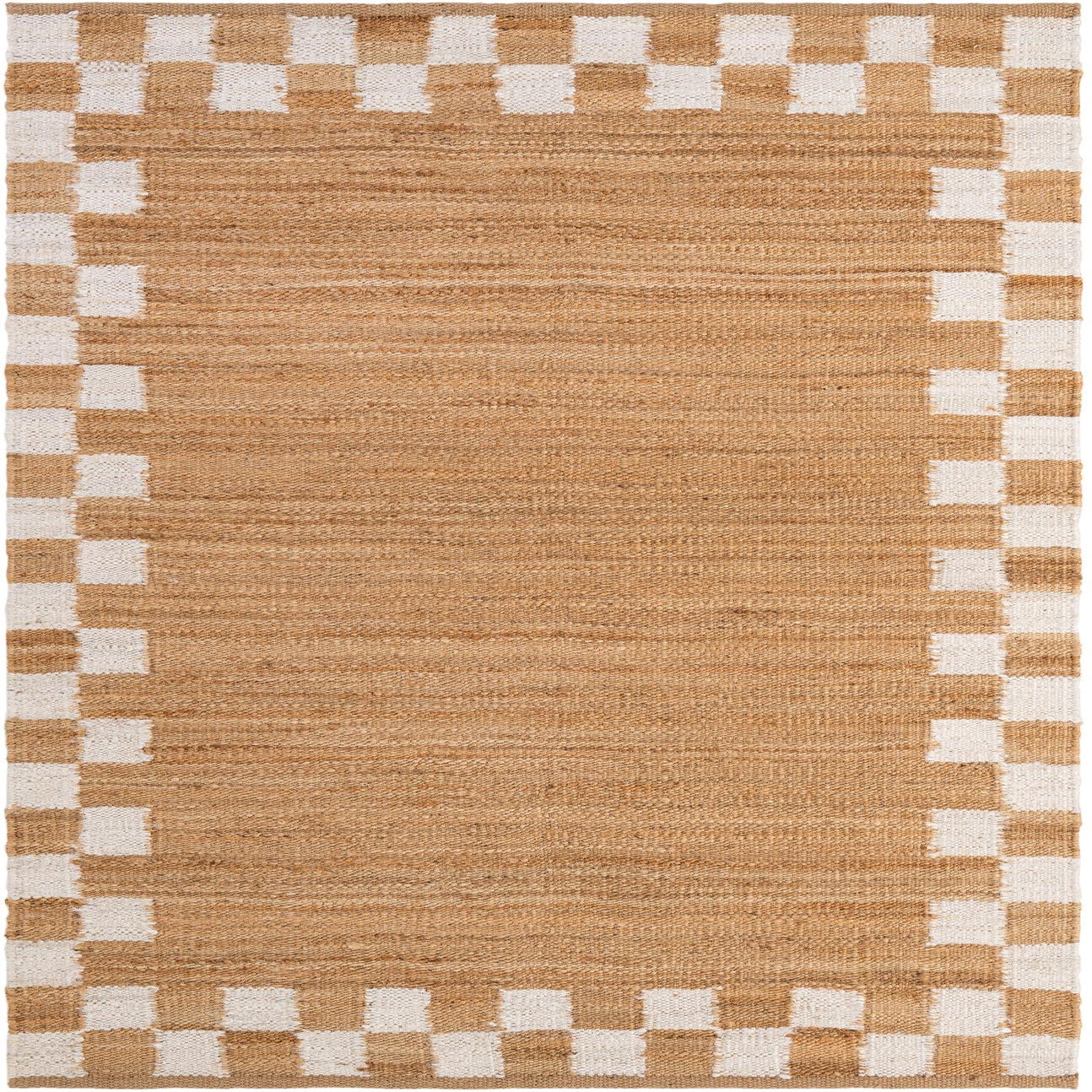 A 5x8 rectangular jute rug featuring a natural brown center and a border of alternating white and brown checkerboard squares.