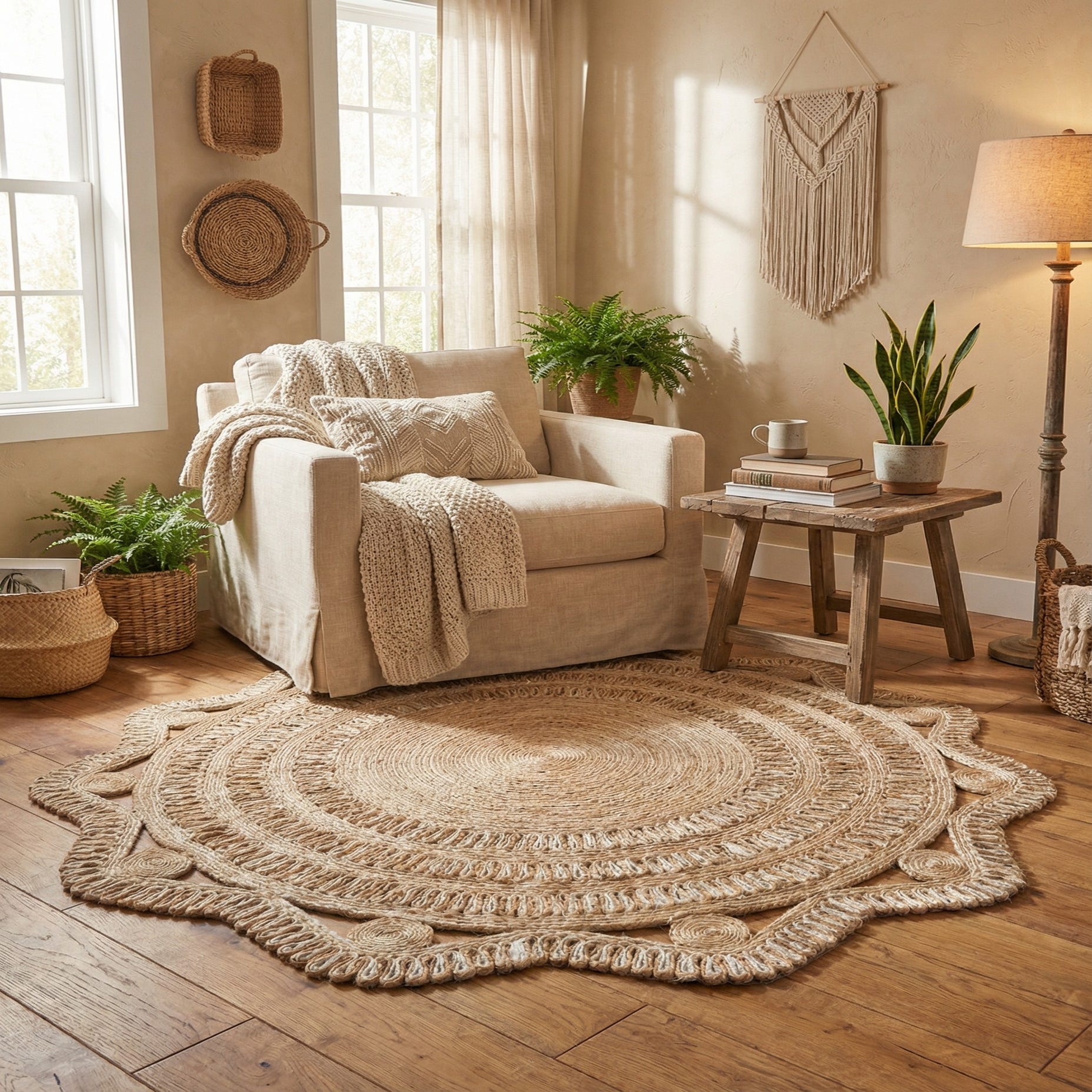 This rug's neutral color palette and organic texture make it highly versatile, suitable for a range of interior design scenarios. Its understated elegance would complement a coastal-themed space, adding to the airy and light ambiance. Alternatively, it could serve as a grounding element in a Scandi-inspired interior, pairing well with minimalist furniture and natural wooden accents.