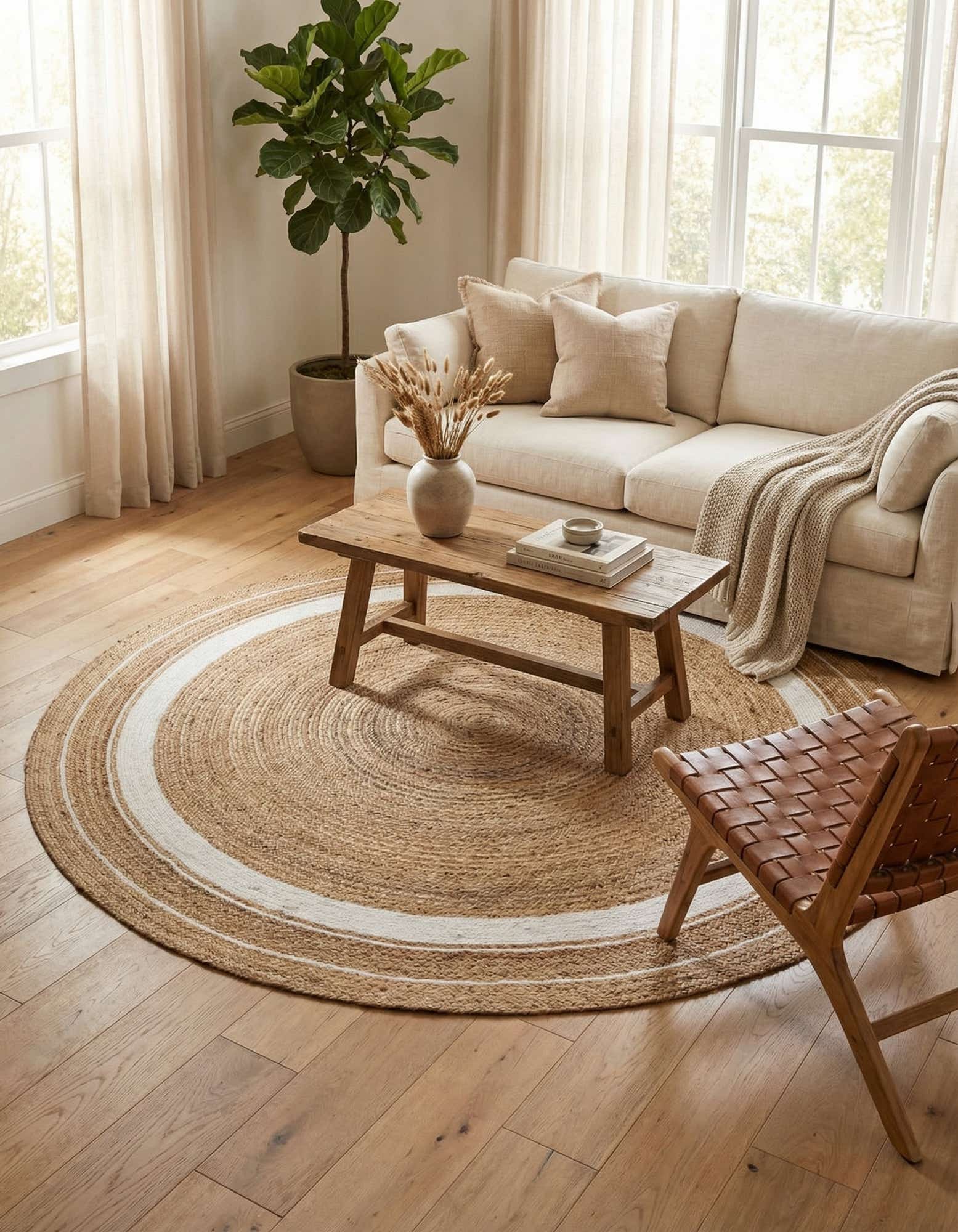A round 8' natural jute rug with a wide ivory border and two thin white stripes, showcasing its textured, braided flatweave.