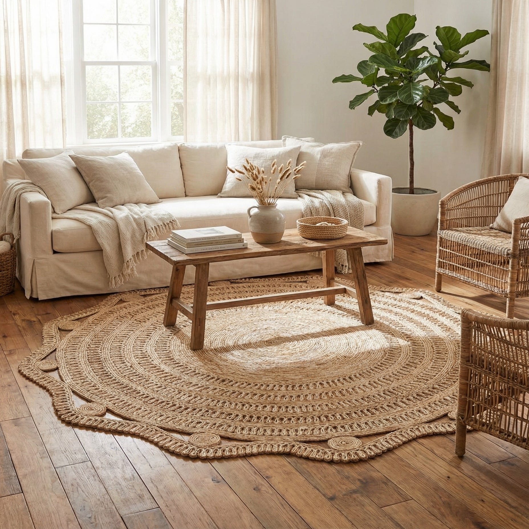 A round, natural jute rug with a textured braided pattern in shades of brown and tan, featuring a scalloped edge.