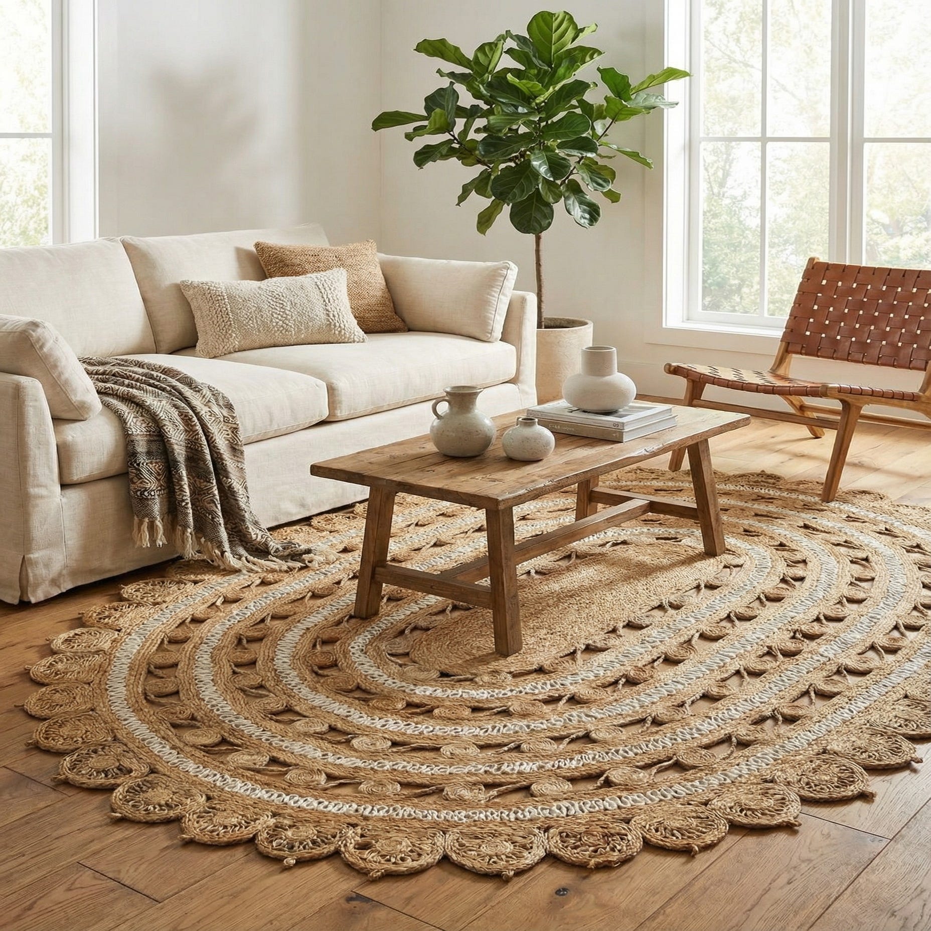 Hand-braided from 100% jute, this oval rug brings a warm, tactile presence to a room with its concentric braided rings and decorative openwork. Natural jute fibers form the core coils while white braided accents trace repeating loops and small round motifs between the rows, finishing with a scalloped perimeter that adds a handcrafted touch. The surface reads low and sculpted — firm braided ridges that you can feel underfoot and subtle gaps in the weave that give the piece a light, airy look.