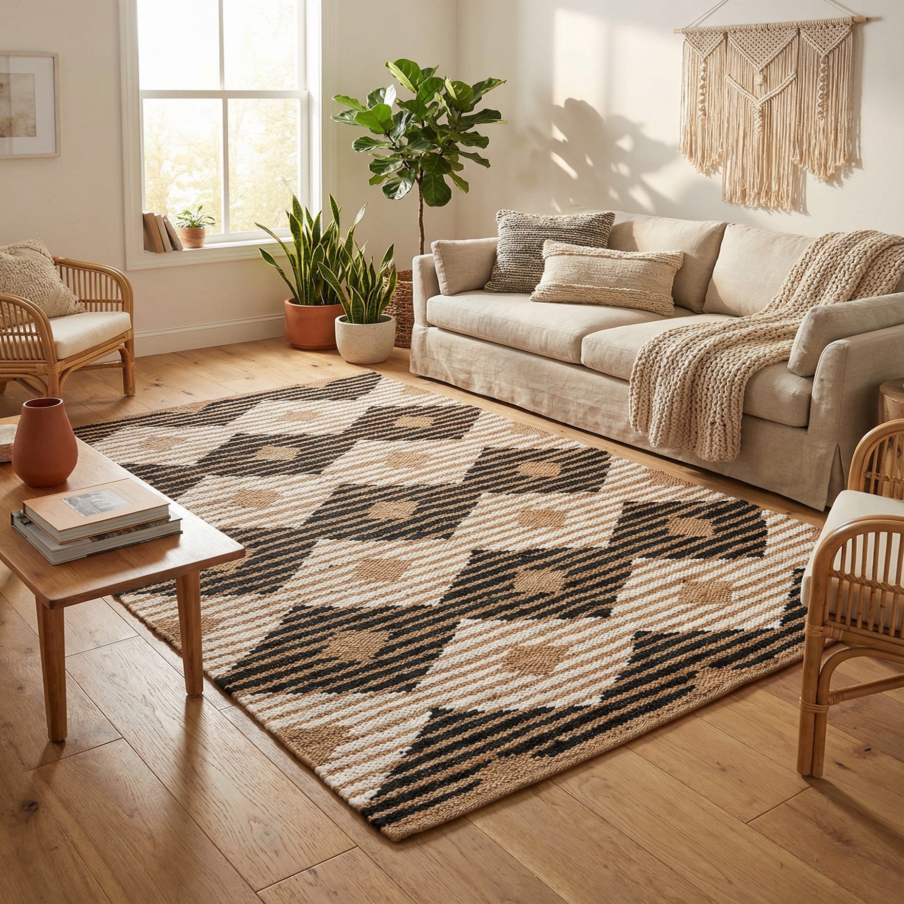 The Chindi Jute Collection offers a 6x9 hand-woven rug that brings a unique blend of modern style and natural fibers to your living space. The rug's pattern features a compelling geometric design, with alternating bands of natural black and ivory that create a striking diamond motif. This juxtaposition of colors not only adds a visual punch but also allows for versatile styling options.