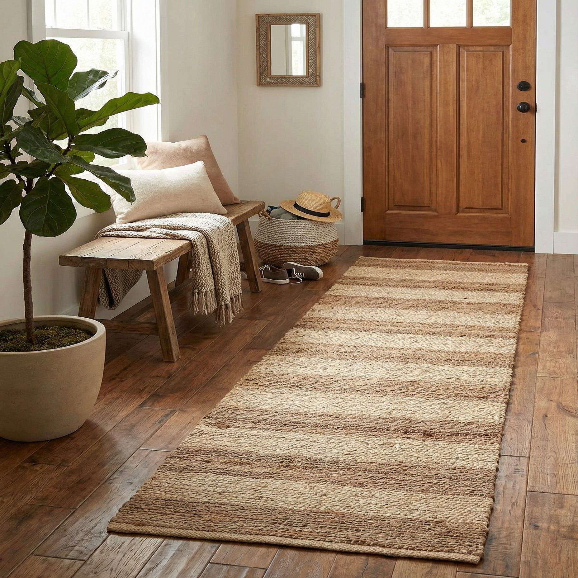 This runner works well in hallways, entryways, or narrow kitchen aisles where a bit of organic texture softens hard floors. It complements coastal, farmhouse, Scandinavian, or casual transitional interiors—pair it with light woods, linen-upholstered seating, woven baskets, rattan or leather accents, and simple greenery for a relaxed, grounded look. Use it to anchor a console and bench in an entry or to add warmth and visual rhythm down a long corridor.