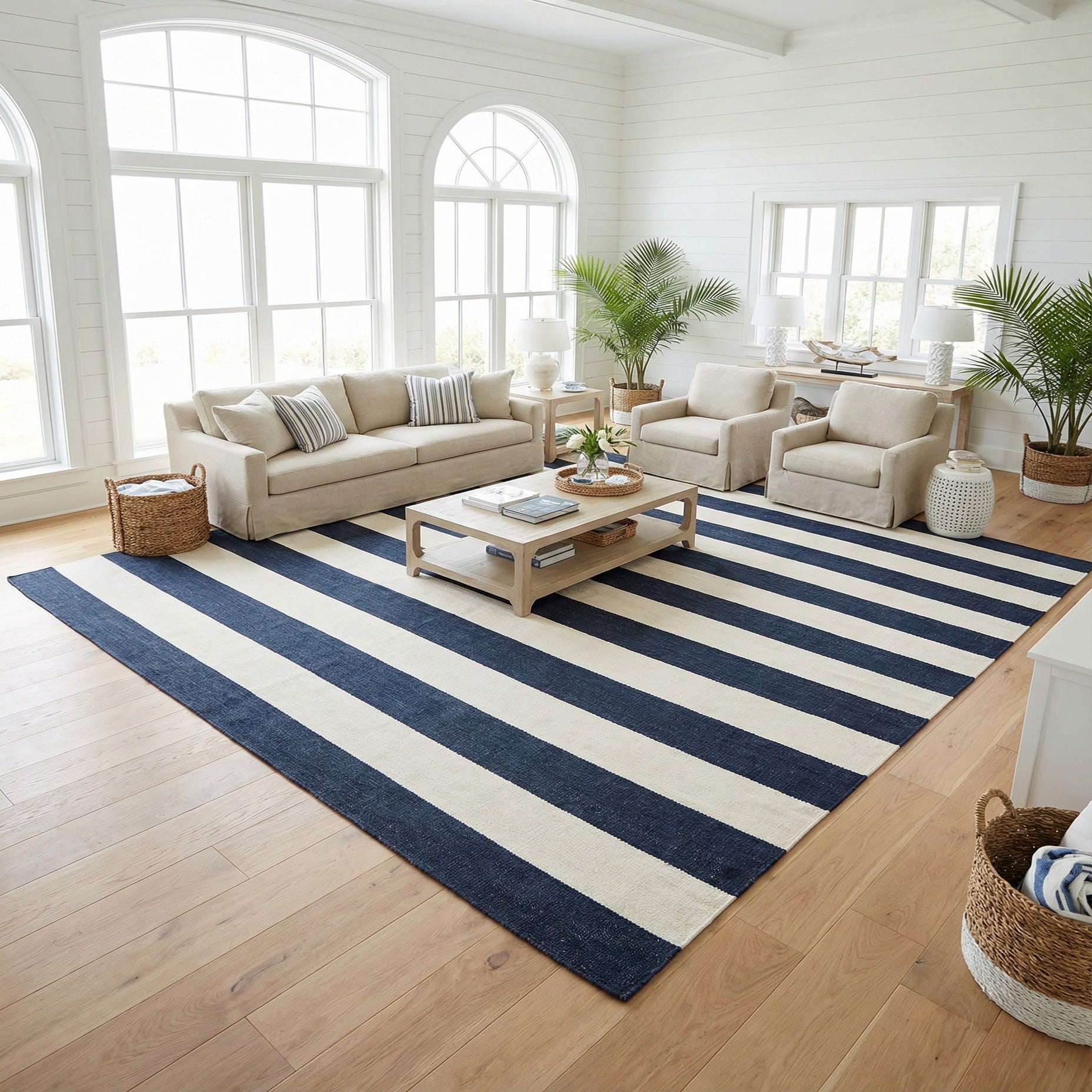 The crisp, linear nature of the striped pattern provides a sense of order and sophistication, making it a versatile addition to any space seeking a contemporary or nautical aesthetic. The natural fibers and flatweave technique contribute to the rug's casual yet polished appearance, suitable for both high-traffic areas and more intimate settings such as a living room, office, or seaside retreat.