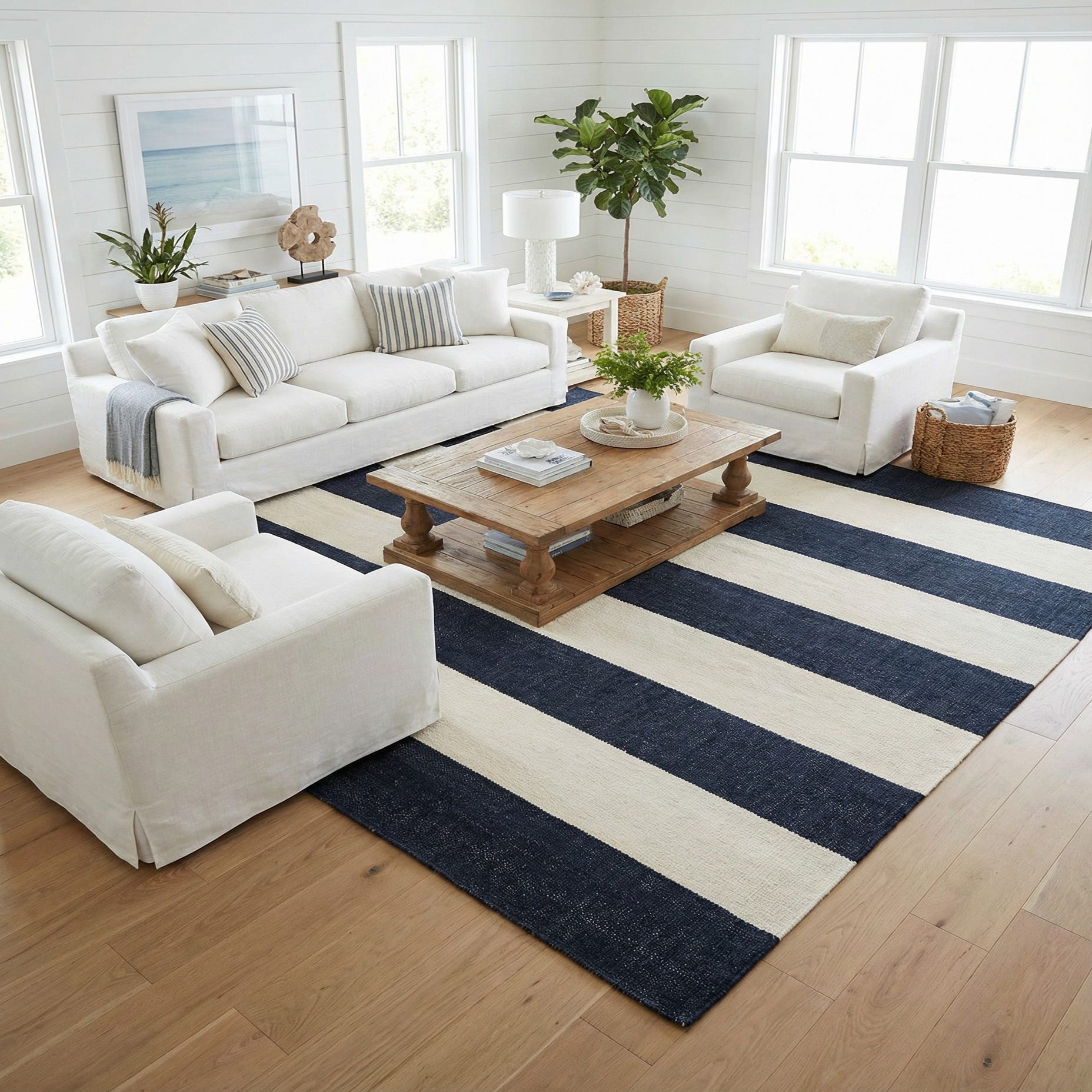 The Jill Zarin Hamptons Collection showcases a 10 Ft Square rug crafted from a blend of jute and wool materials. This rug features a flatweave construction, emphasizing durability and a textural, organic feel underfoot. The design presents a clean and bold pattern of alternating stripes in Nautical Navy and Ivory, with the Nautical Navy serving as the dominant background color.