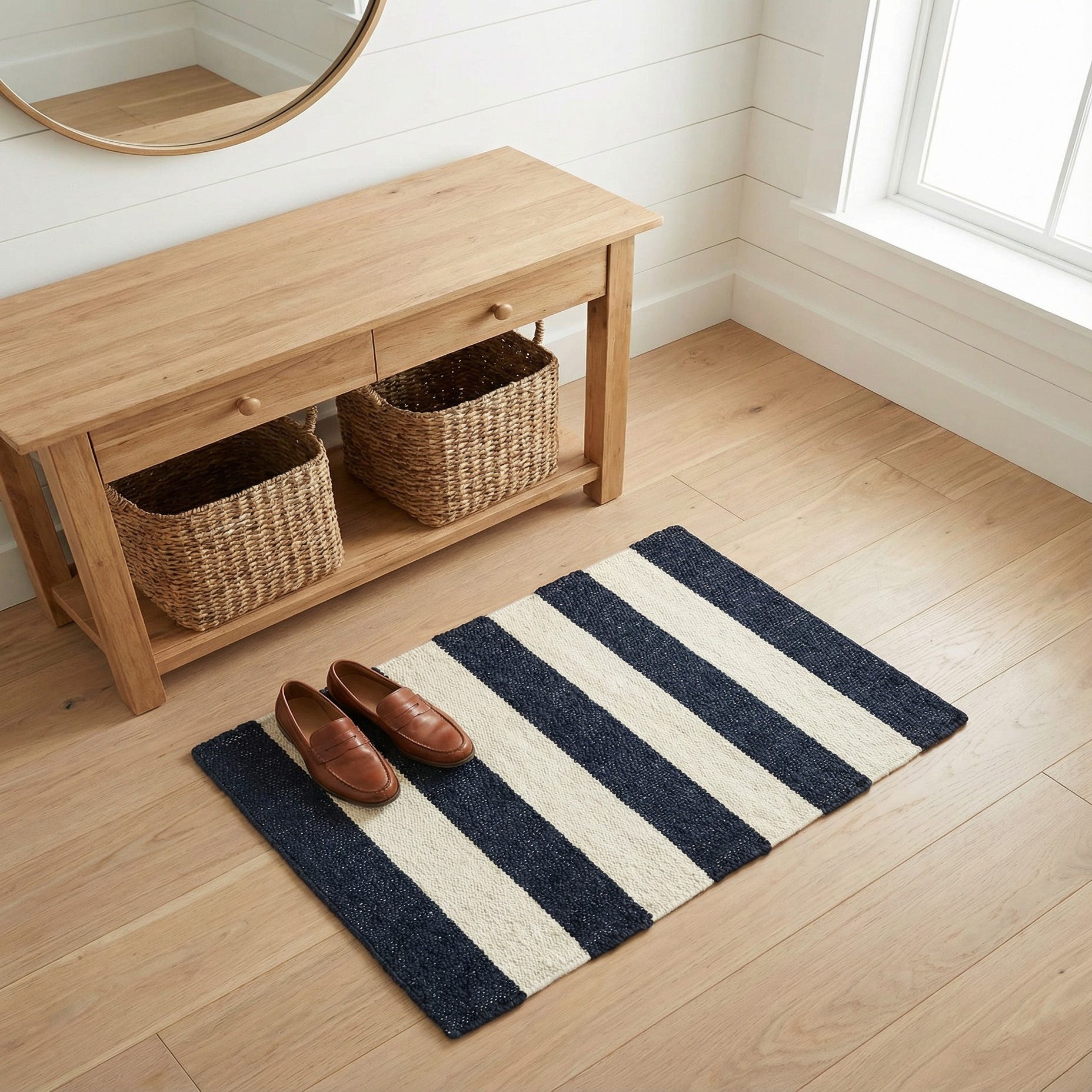 This 2x3 rug from the Jill Zarin Hamptons collection showcases a bold and timeless design, featuring broad horizontal stripes in a classic Nautical Navy and Ivory color palette. The background color is a deep Nautical Navy, providing a strong visual anchor for the contrasting Ivory stripes. Hand-woven from a blend of jute and wool, the rug boasts a durable flatweave construction that offers a tactile experience underfoot.