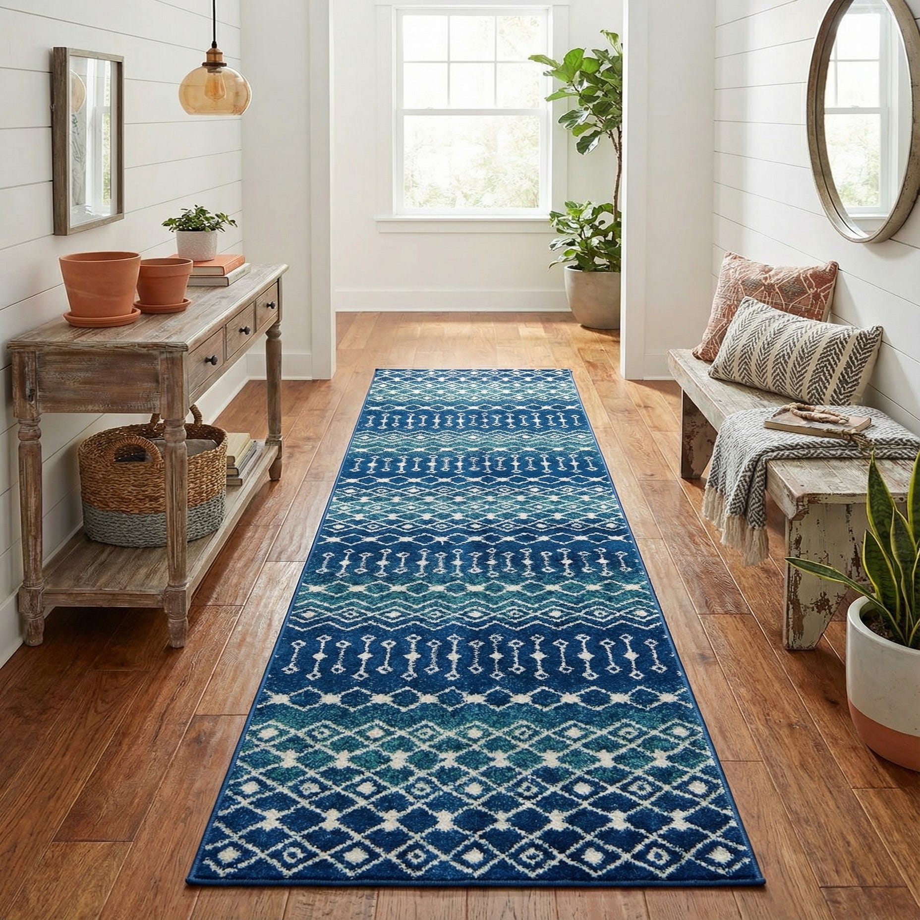 A 12 ft runner rug featuring a bohemian tribal pattern in shades of blue and white, ideal for a hallway.