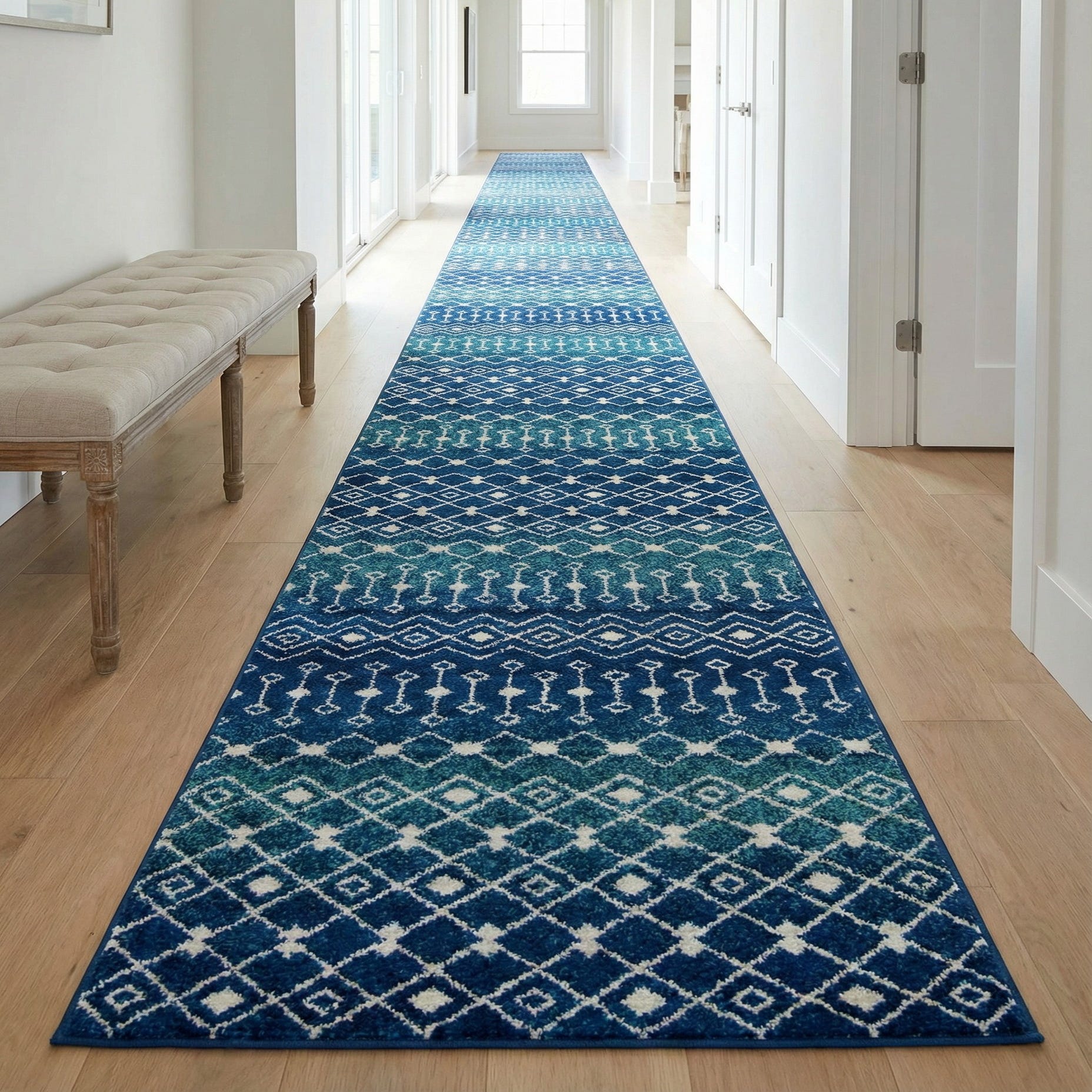 Ideal for hallways, narrow entries, and galley kitchens, this runner brings color and pattern to transitional, coastal, or contemporary interiors. It pairs naturally with light oak floors and white trim, navy upholstered benches or slipcovered seating, and brass or matte-black hardware for a balanced, layered look. Use it to add visual interest along a corridor or to anchor a gallery-style space without overwhelming existing décor.