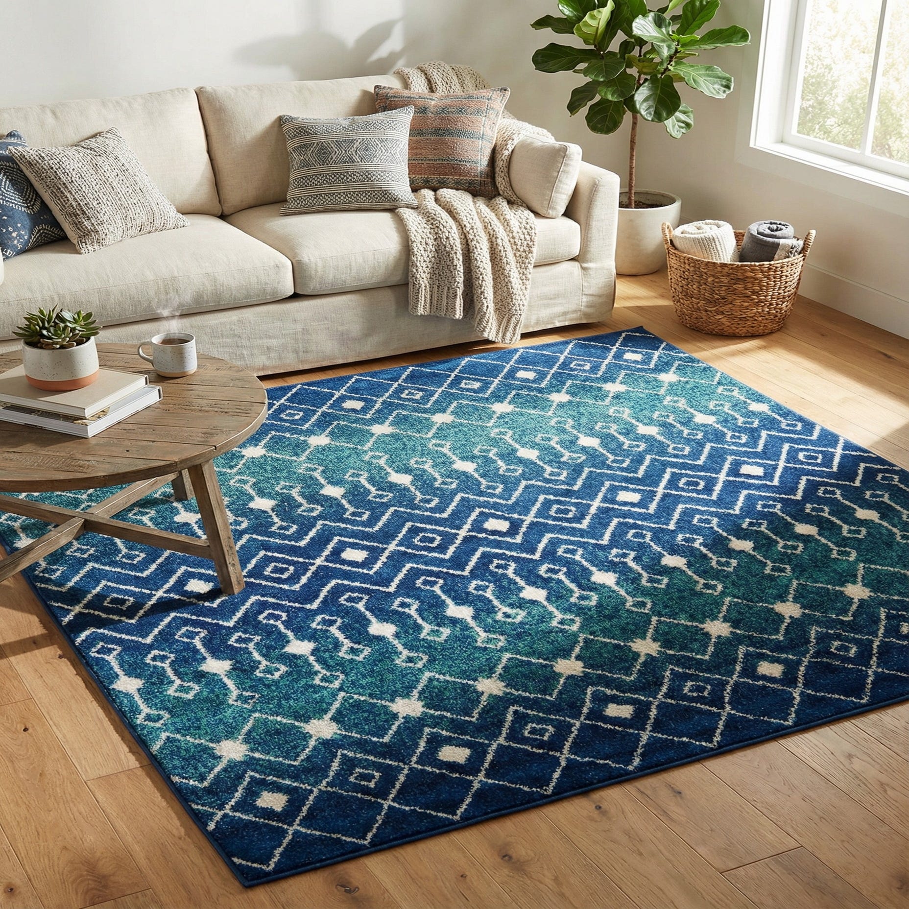 Place this rug beneath a seating group to anchor a living room, use it to define a layered bedroom vignette, or center it in a home office to add color and pattern without overwhelming the space. It pairs well with light or warm wood finishes, crisp white upholstery, and brass or matte black accents, and complements coastal, contemporary, transitional, and global-inspired interiors. Add textured cushions or natural-fiber accessories to play against the geometric lines and deepen the room’s visual interest.
