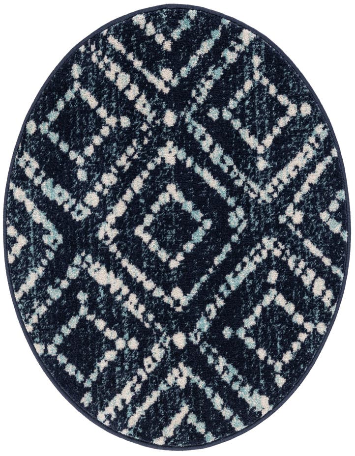 A layered geometric pattern anchors this rug: rows of connected diamond motifs, zigzag bands and vertical key-like chains create a rhythmic Moroccan-inspired trellis across a rich navy-and-teal ground. Ivory accents trace each shape in crisp contrast, giving the design clean definition against the deep, slightly variegated background. The machine-made polypropylene pile has a responsive, slightly plush hand with a low-to-medium profile and a gentle sheen that catches light without appearing glossy. The surface reads textured underfoot, with the ivory pattern rising just enough to add subtle dimensionality.