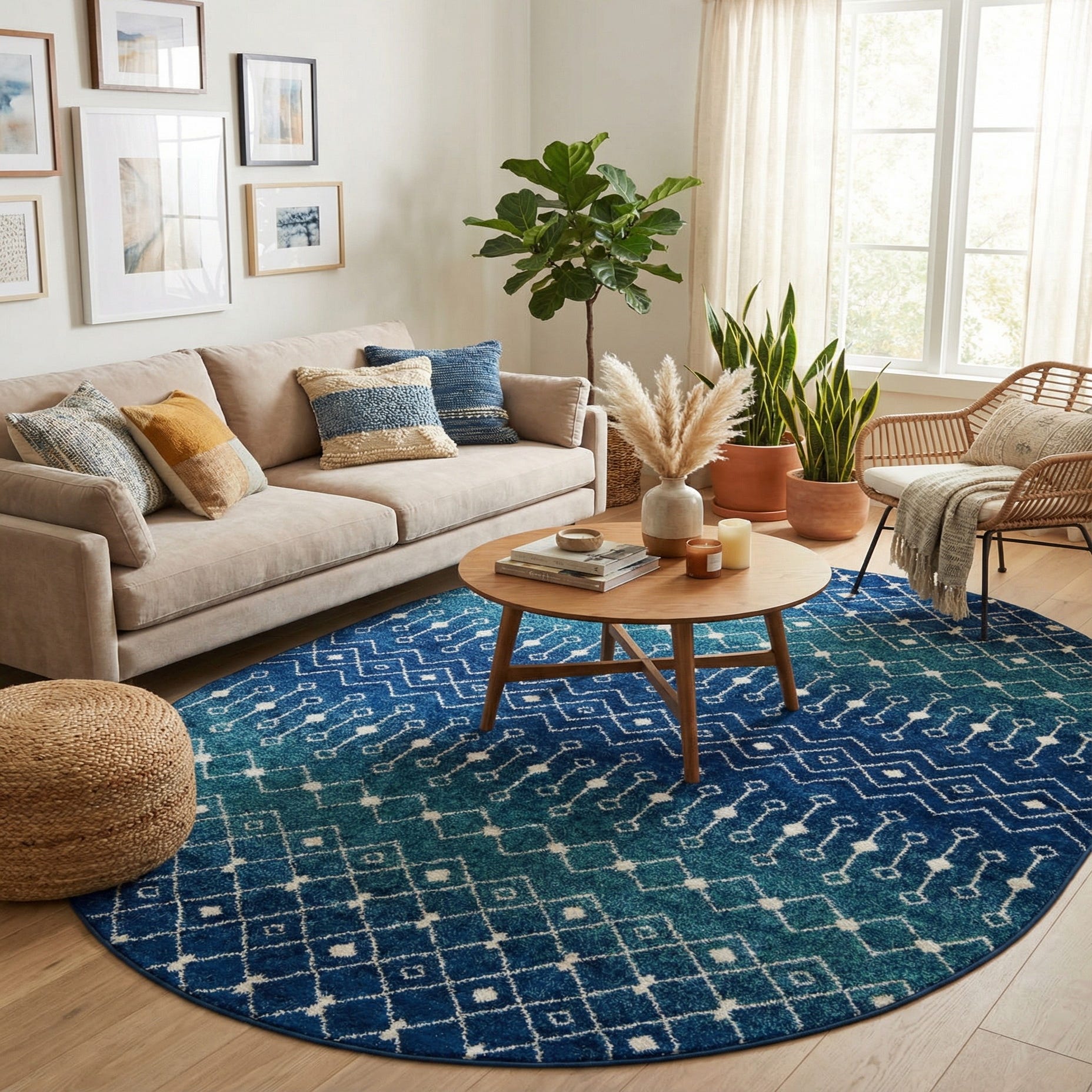 An oval blue Moroccan Trellis rug with a gradient of dark to teal blue, featuring white geometric patterns.