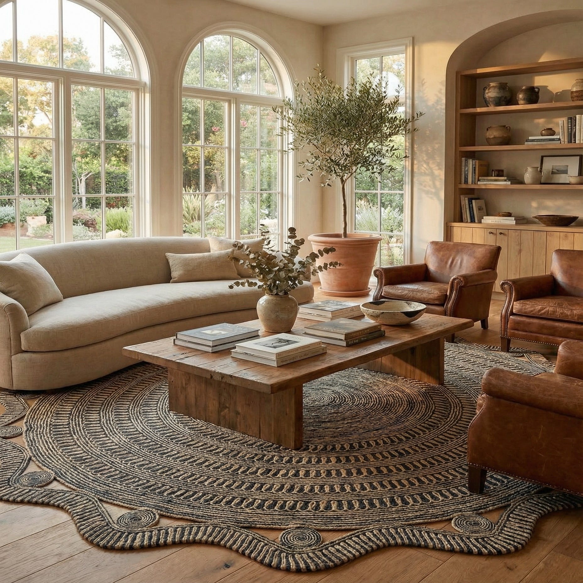 This rug's inherent coastal charm and organic texture would particularly shine in spaces with nautical, bohemian, or rustic decor themes. It would also serve well in a minimalistic setting where its pattern can act as a statement piece without overwhelming the room's aesthetic. Given its circular shape and bold pattern, it's best placed in areas where it can be showcased fully, such as under a round dining table, a seating area, or as a striking entryway welcome piece.