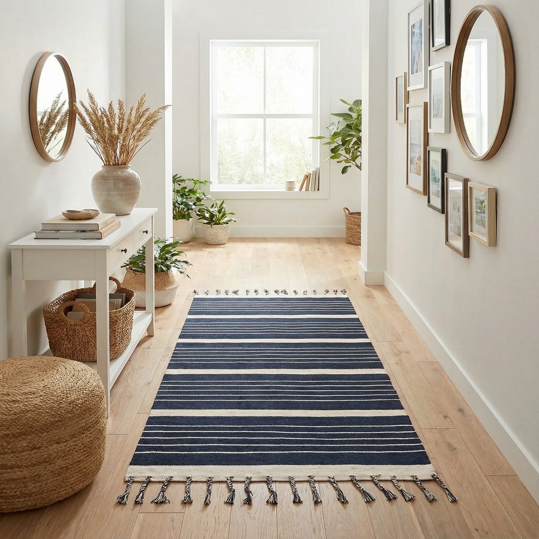 Hand-woven of 100% cotton, this flatweave rug presents a clean, linear stripe pattern in deep navy and crisp white. Broad navy bands alternate with sets of narrow white stripes to create a steady, rhythmic layout across the surface, while braided tassels at each end add a handmade, relaxed detail. The cotton weave produces a low-profile texture with a gently nubby hand that lies flat and feels pleasantly tactile underfoot.