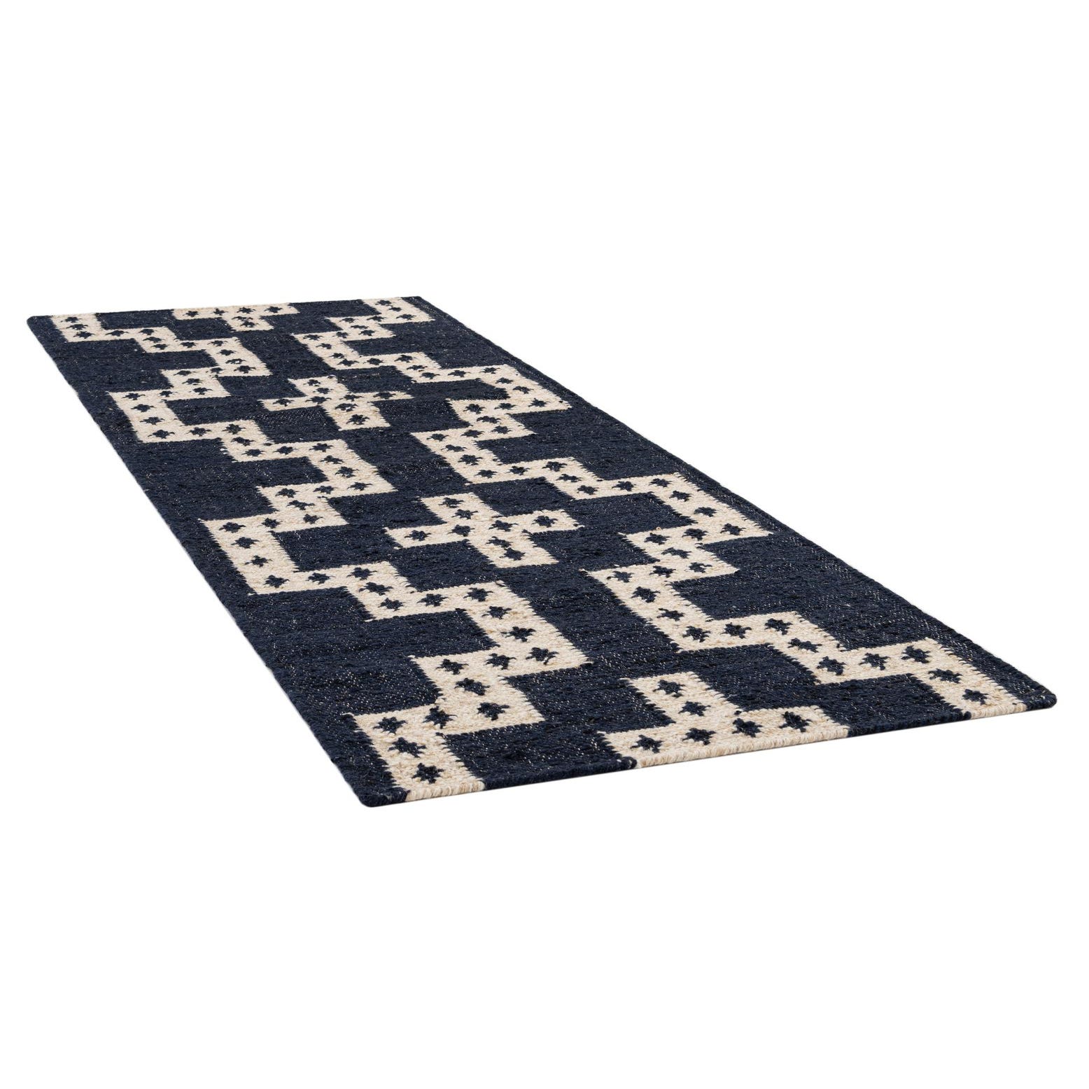 Hand-woven from 100% wool, this runner pairs a deep navy ground with bold white geometric bands and cross motifs for a clean, graphic look. The stepped patterns and small diamond accents create a rhythmic layout that reads both modern and rooted in traditional flatweave design. Running your hand across the surface reveals a tactile, slightly nubby weave—the wool feels warm and substantial, with the lighter motifs sitting a touch higher for subtle dimensional contrast.