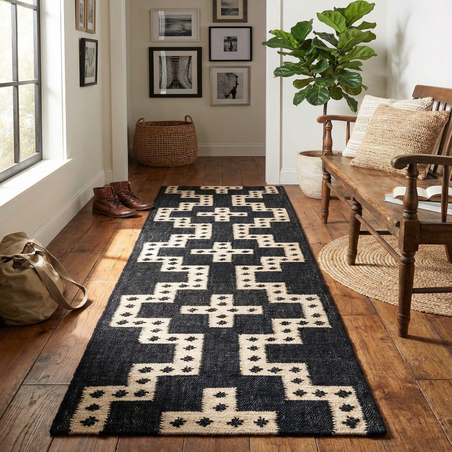 A hand-woven, 100% wool runner with a kilim-style flatweave, this piece pairs a deep navy ground with crisp white geometric motifs for a clean, graphic look. The pattern alternates bold plus-shaped centers with stepped, maze-like borders, each area dotted with small star-like accents that add a subtle, artisanal rhythm. Running your hand across the surface reveals a tactile contrast between the smooth, tightly woven navy field and the slightly raised, denser white design—a sturdy, textural finish typical of wool construction.