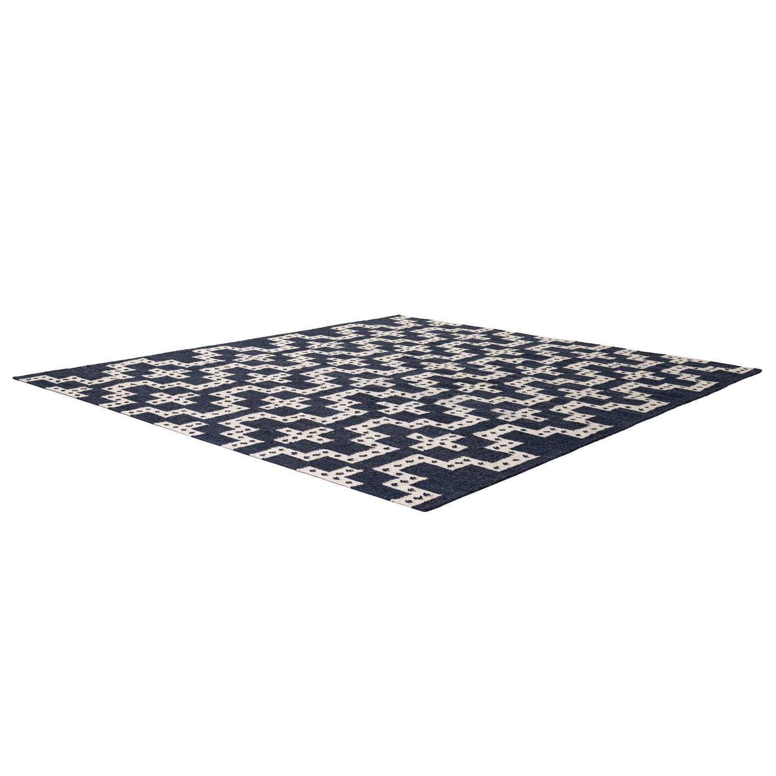 An 8x10 rectangular flatweave wool rug featuring a repeating tribal geometric pattern in dark blue and off-white.