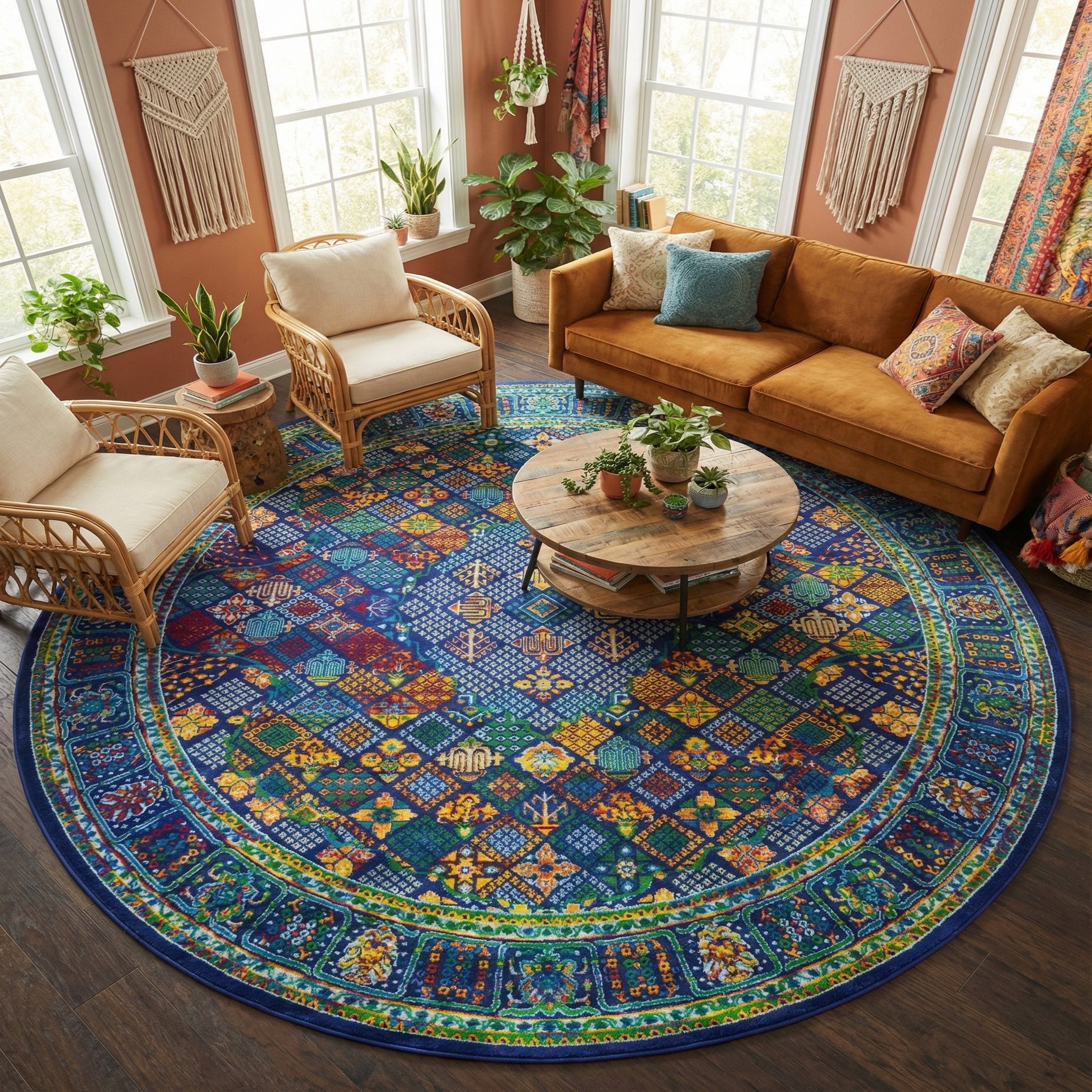 This round piece works particularly well beneath a circular dining table or as the focal point in a seating area, where its bold navy background can ground brighter furnishings. Pair it with warm wood tones and ivory or navy upholstery to pick up the rug’s highlights, or use it to add color and pattern to a global-inspired or eclectic living room. It also complements contemporary and mid-century pieces, bringing an energetic yet composed layer to a home office, sunroom, or entry space.