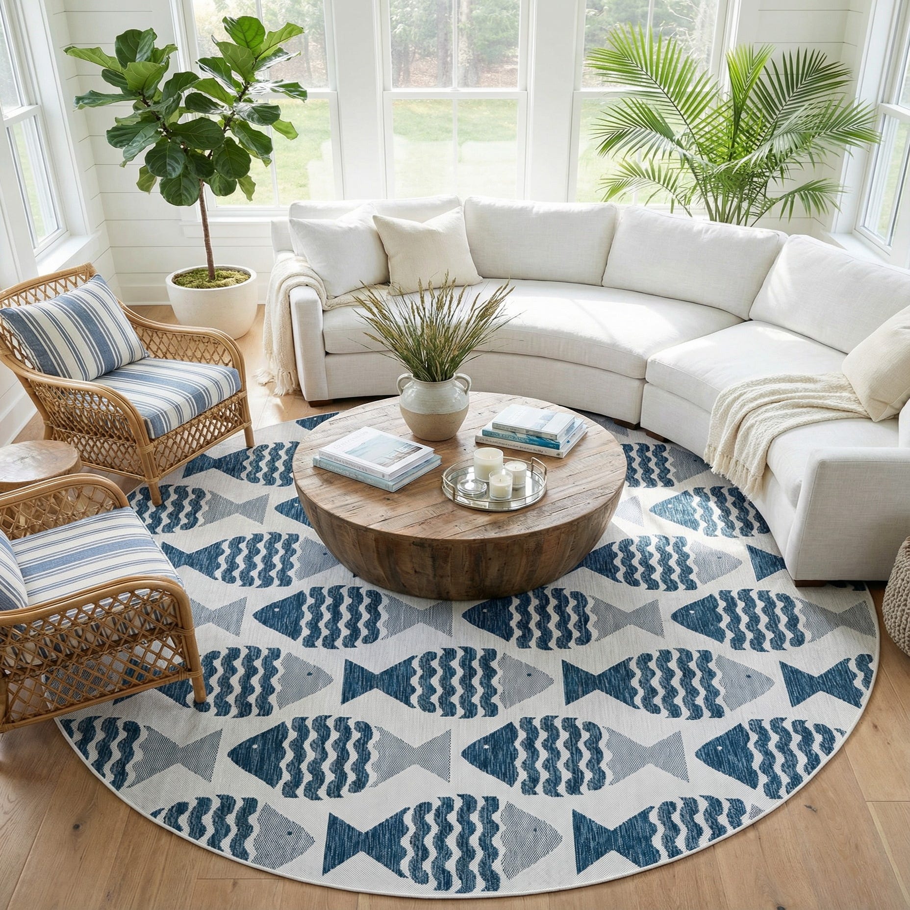 Woven from 100% polypropylene, the rug has a low-profile, tightly woven surface that feels smooth underfoot with a slight textured definition where the pattern sits. It works well on a covered patio or screened porch, under a round dining table, or layered in a sunroom or beach house living area. Pair it with light wood furniture, rattan seating, crisp white textiles, and navy accents for a cohesive coastal look.