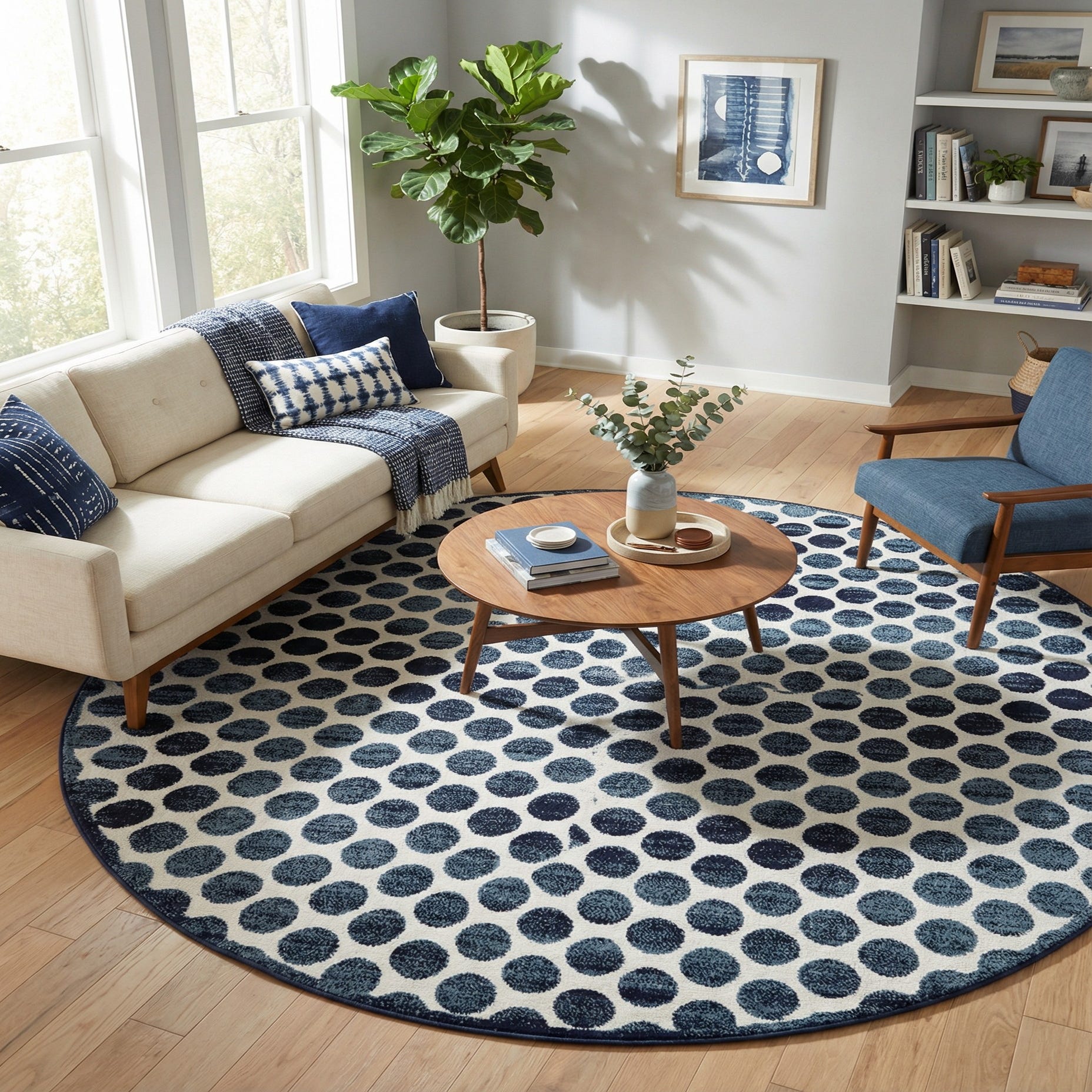 A bold polka-dot pattern of ivory circles pops against a navy blue field in this round outdoor rug, giving a clean, graphic look with a touch of playfulness. The dots have a subtly raised, low-profile texture that contrasts with the smoother navy background, creating gentle dimensionality underfoot. Machine-made from 100% polypropylene, the construction produces a firm, low-pile surface that holds the pattern crisply while remaining suited to outdoor settings.