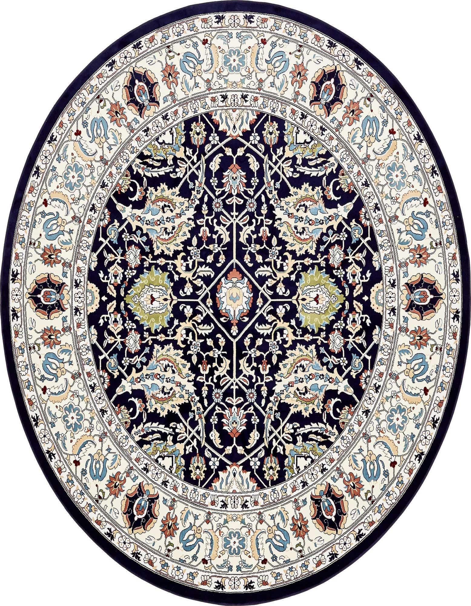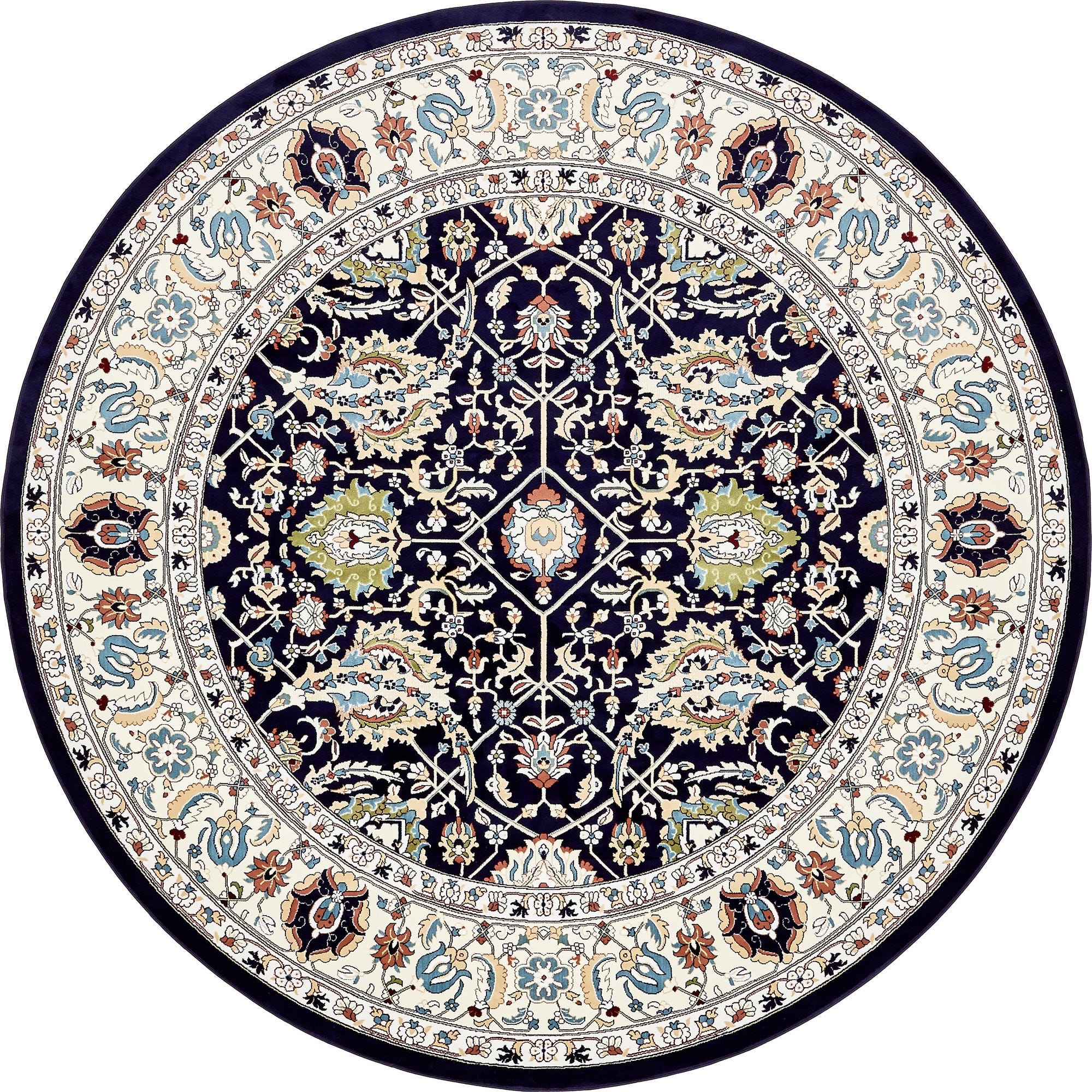 Primary color is Navy Blue. Colors in this rug include: Navy Blue, Blue, Burgundy, Cream, Green, Ivory, Plum Red, Tan.