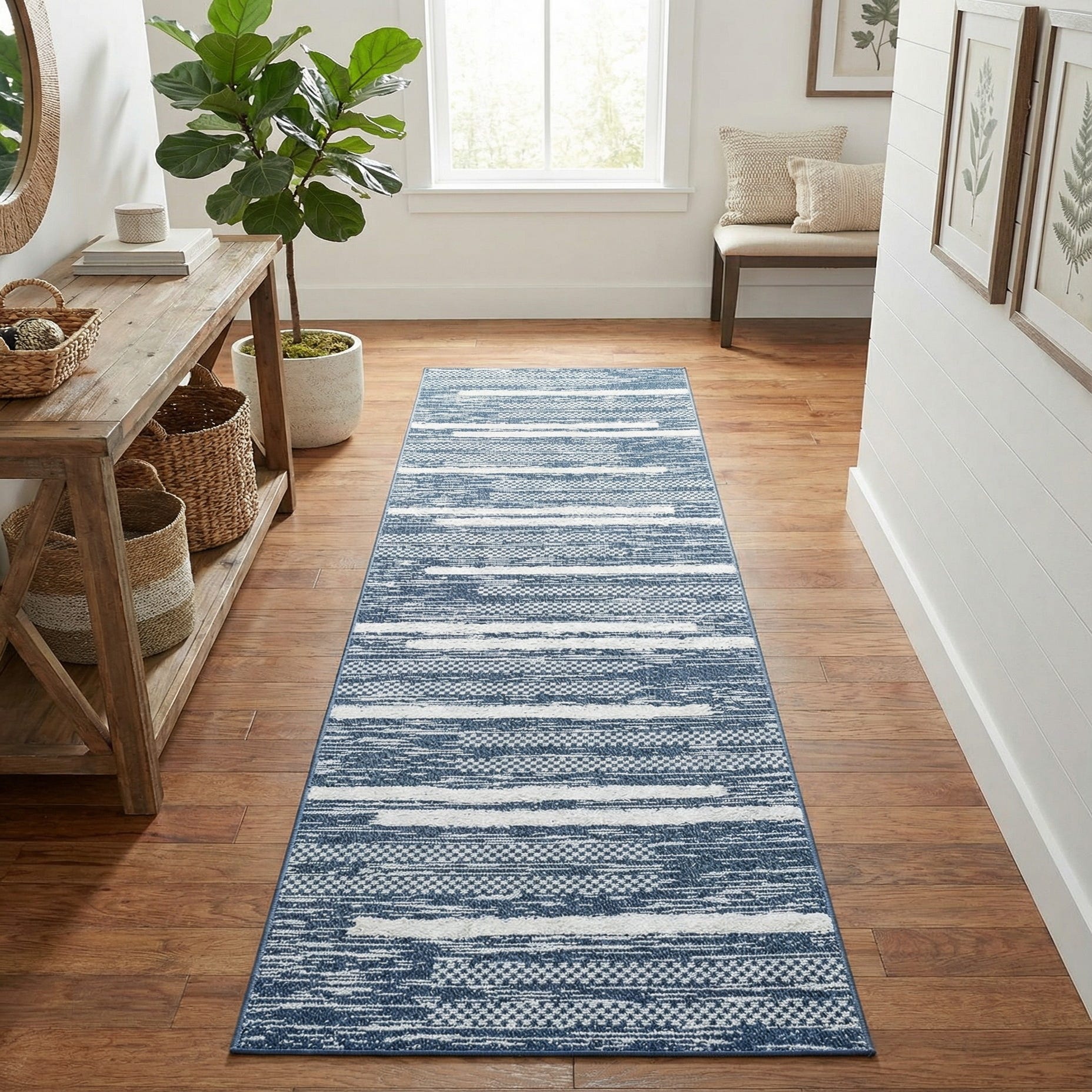 This runner works well in narrow hallways, entryways, or alongside a kitchen island where a long, grounding element is needed. Pair it with light wood floors and white or neutral furnishings for a coastal-modern vibe, or place it in a sleek, contemporary corridor to add pattern without overwhelming the space. The navy and ivory palette also complements navy upholstery or brass accents for a pulled-together scheme.