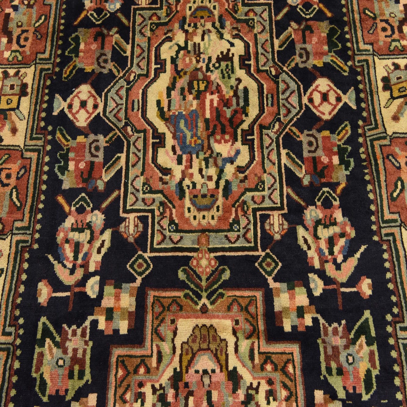 Primary color is Navy Blue. Colors in this rug include: Navy Blue, Blue, Cream, Green, Olive, Red, Peach.