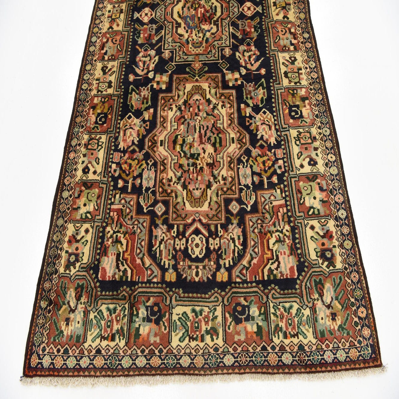 The Bakhtiar collection presents a hand-knotted 10 Ft runner crafted with 100% wool that offers both durability and comfort underfoot. Its intricate pattern boasts a rich array of colors, with a deep navy blue background that prominently displays the artistry of the design. Ornate detailing includes motifs in an inviting palette of blue, cream, green, olive, red, and peach, providing a captivating visual appeal.
