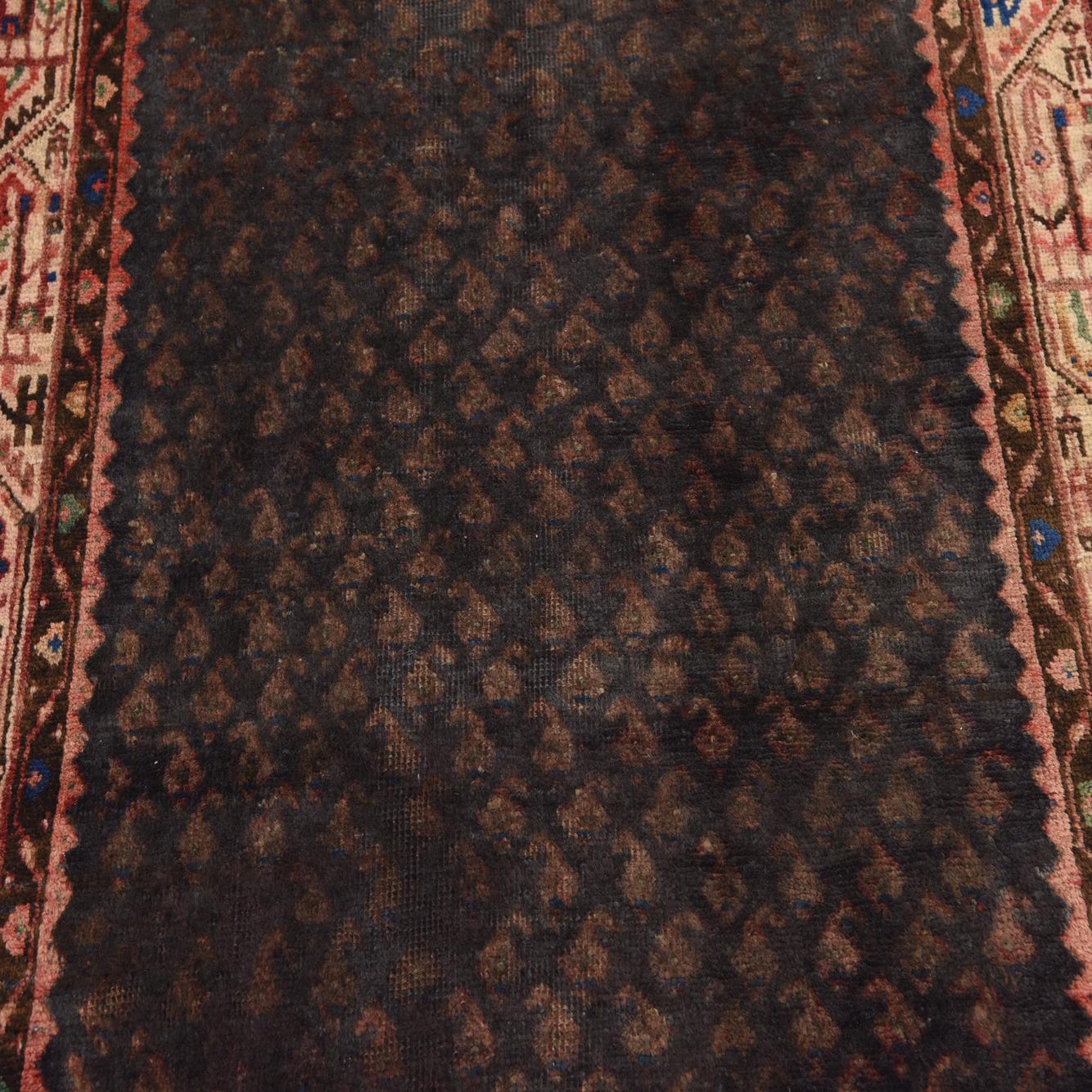 The presence of abrash adds to the antique charm of the piece, displaying variations in color that give the rug a unique character. Evidence of bleeding contributes to the aged appearance, while the low pile height suggests a history of loving use and contributes to the rug's authentic vintage allure. The runner is finished with fringe detailing, adding a classic touch to the design.