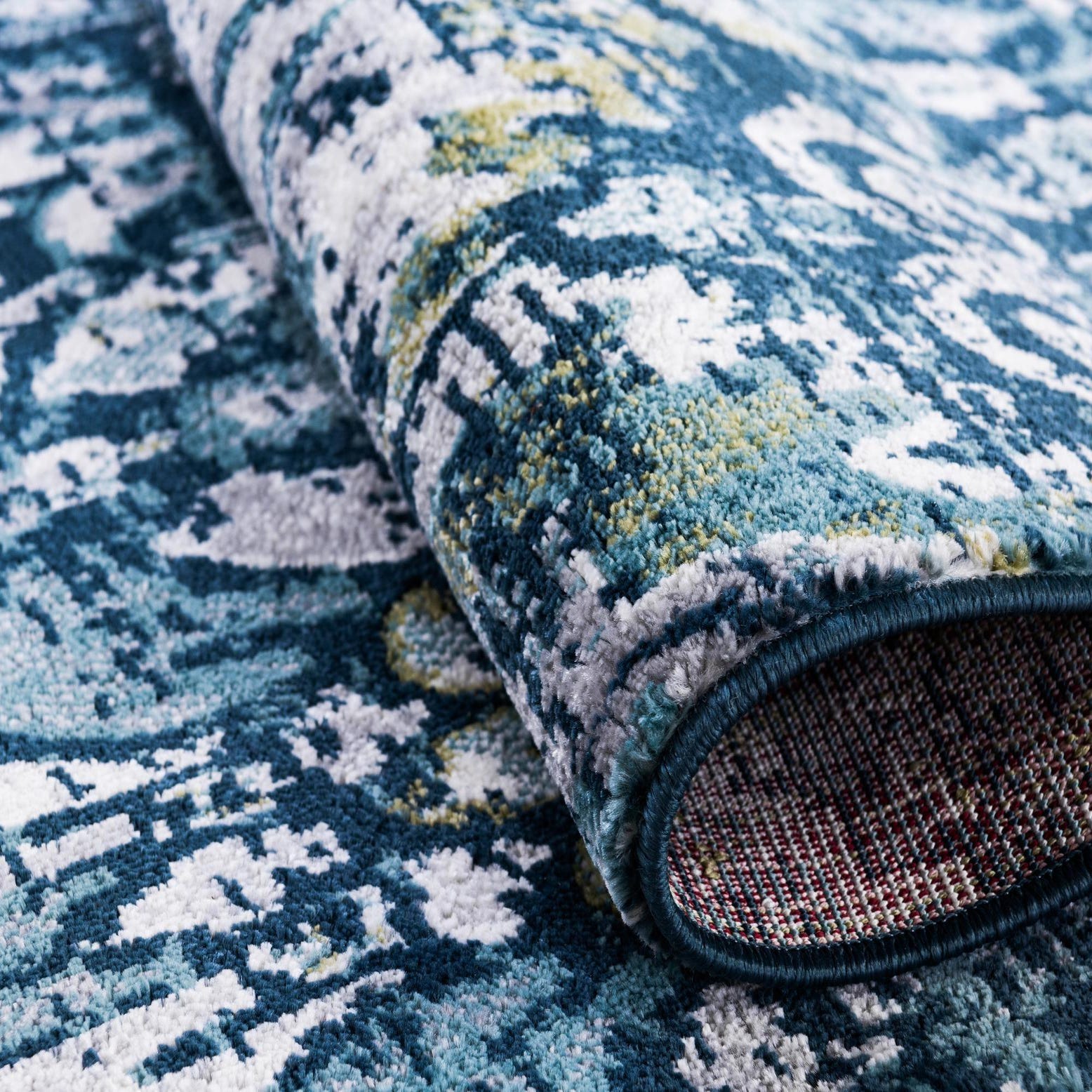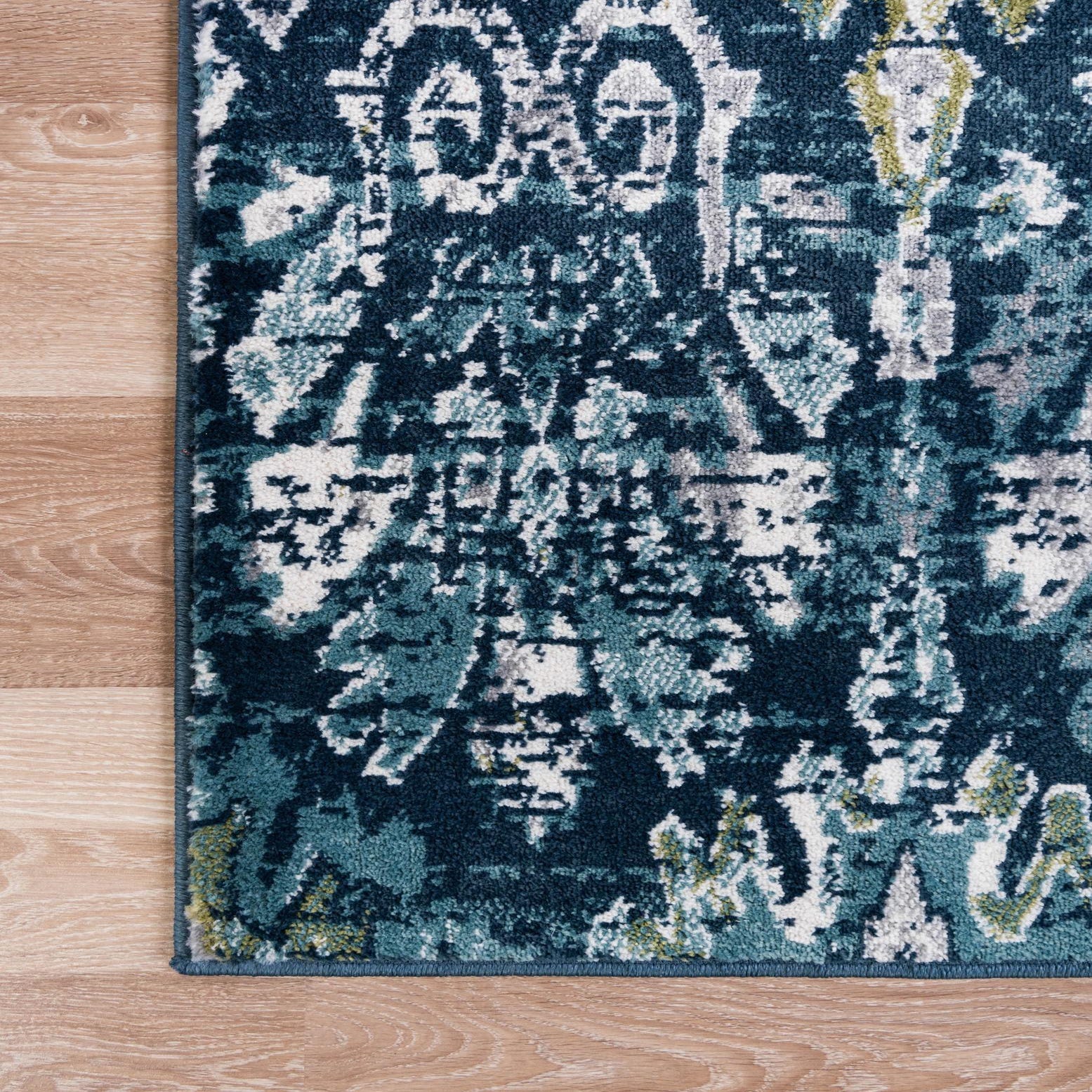 A layered, vintage-inspired pattern unfolds across a navy blue ground, where distressed medallion and floral motifs blend into a painterly, almost weathered surface. Ivory highlights and shades of blue and gray lift the design while small pops of green add a bright, unexpected accent. Machine-made of 100% polypropylene, the rug has a low, dense pile that feels smooth underfoot with a subtle texture from the printed pattern—comfortable enough for daily use without appearing plush.