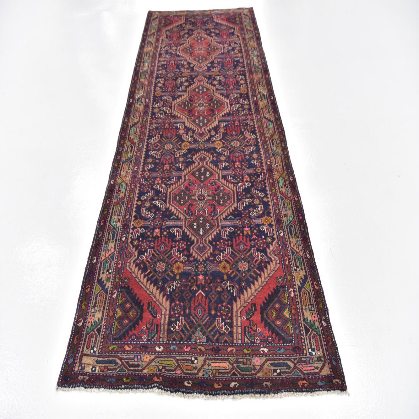 The Darjazin Collection presents a finely crafted 10 Ft Runner rug, hand-knotted from 100% wool, with a rich tapestry of colors woven into its intricate design. This semi-antique piece boasts a diverse color palette, including Navy Blue, Beige, Black, Blue, Brown, Green, Ivory, Olive, Orange, Red, and Pink. The dominant background color of Navy Blue sets a deep and luxurious tone for the geometric and botanical patterns that unfold across the rug's surface.