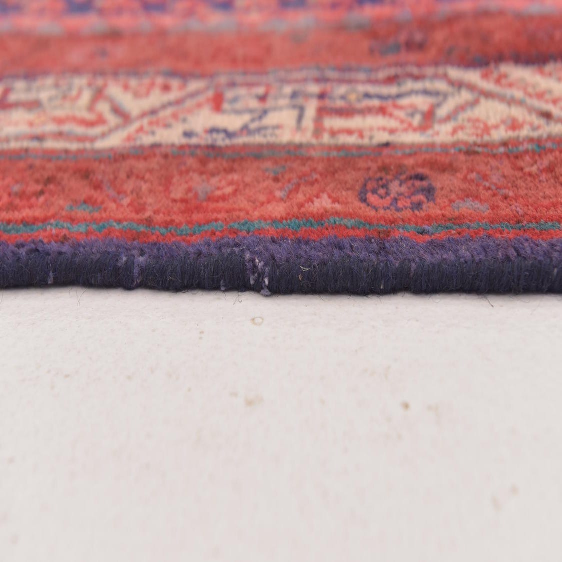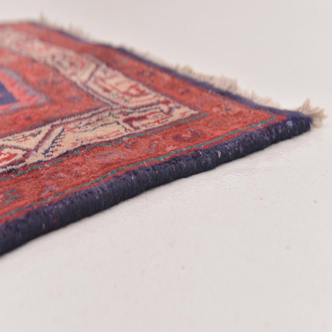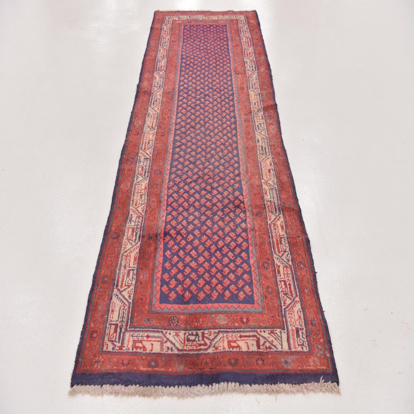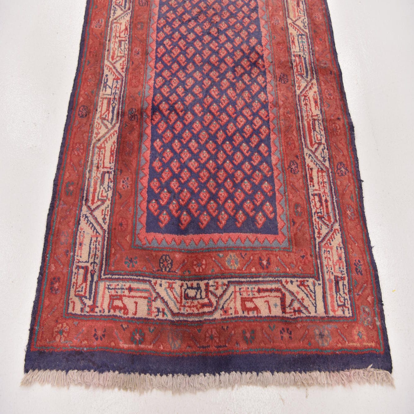 A 10 ft Farahan runner rug featuring a navy blue field with red diamond patterns and a detailed red and cream border.
