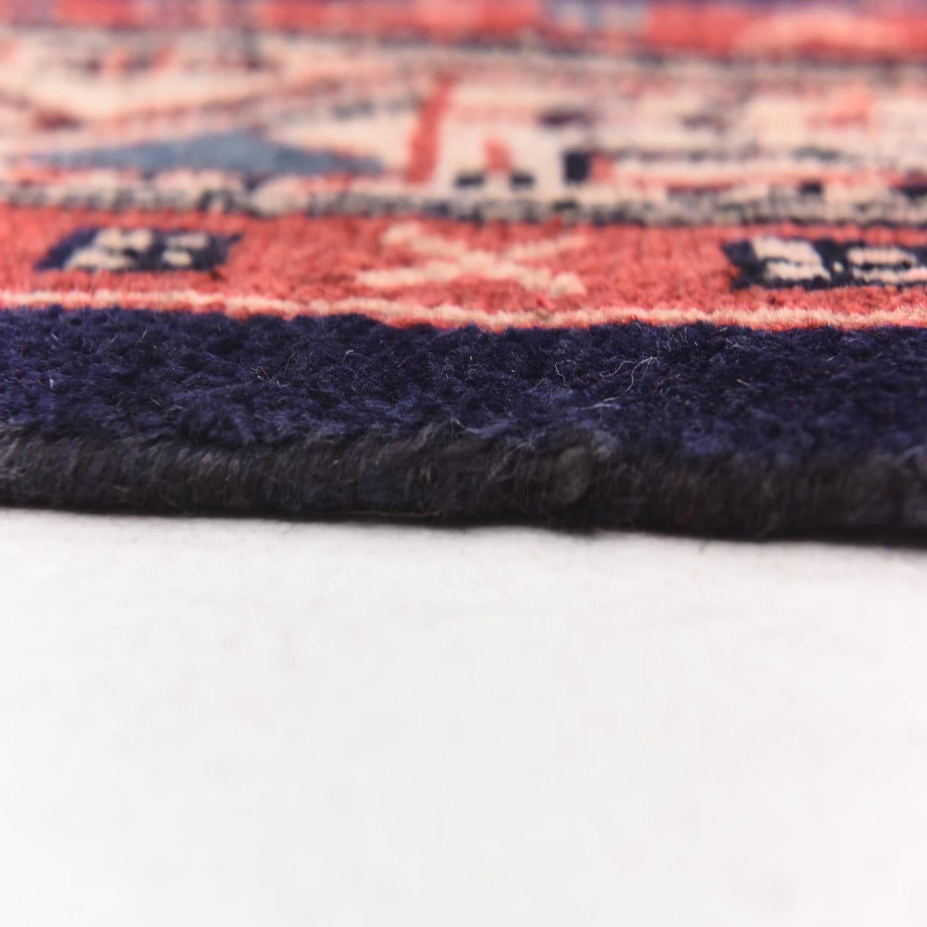 A dense field of small, leaf-like boteh motifs fills a deep navy ground, each motif woven in warm salmon and pink tones with accents of light blue and green that lift the overall palette. A narrow red guard border and an ivory outer band introduce geometric and hooked motifs in complementary blues and reds, giving the rug a classic, handwoven character. Hand-knotted from 100% wool, the pile is tightly woven and sits with a comforting density underfoot, offering a soft, slightly cushioned feel and subtle textural variation where the motifs catch the light.