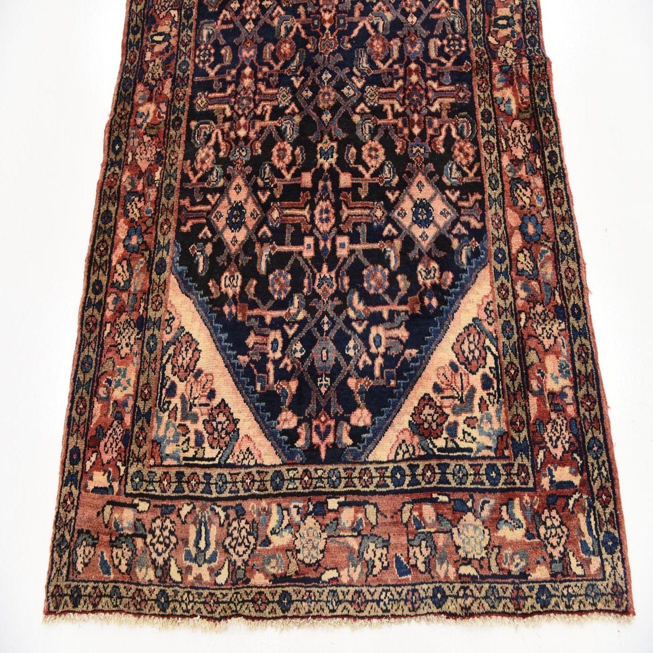 A 10 ft runner rug with a navy blue field, tribal Persian patterns, and a red border, ideal for hallways.