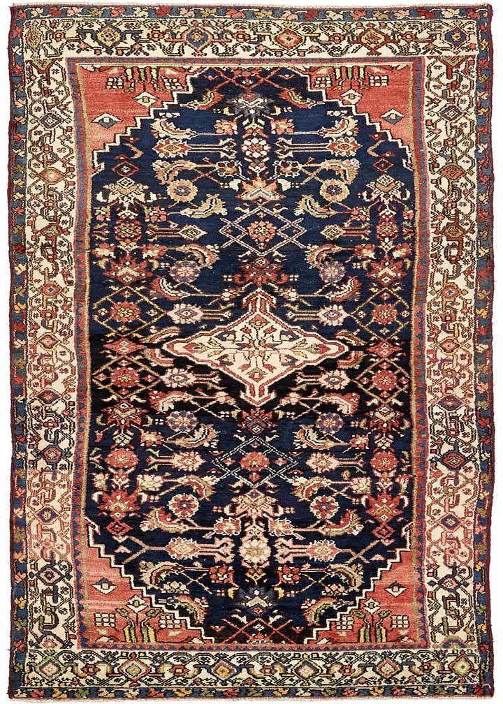 Primary color is Navy Blue. Colors in this rug include: Navy Blue, Blue, Green, Ivory, Peach, Red, Tan.