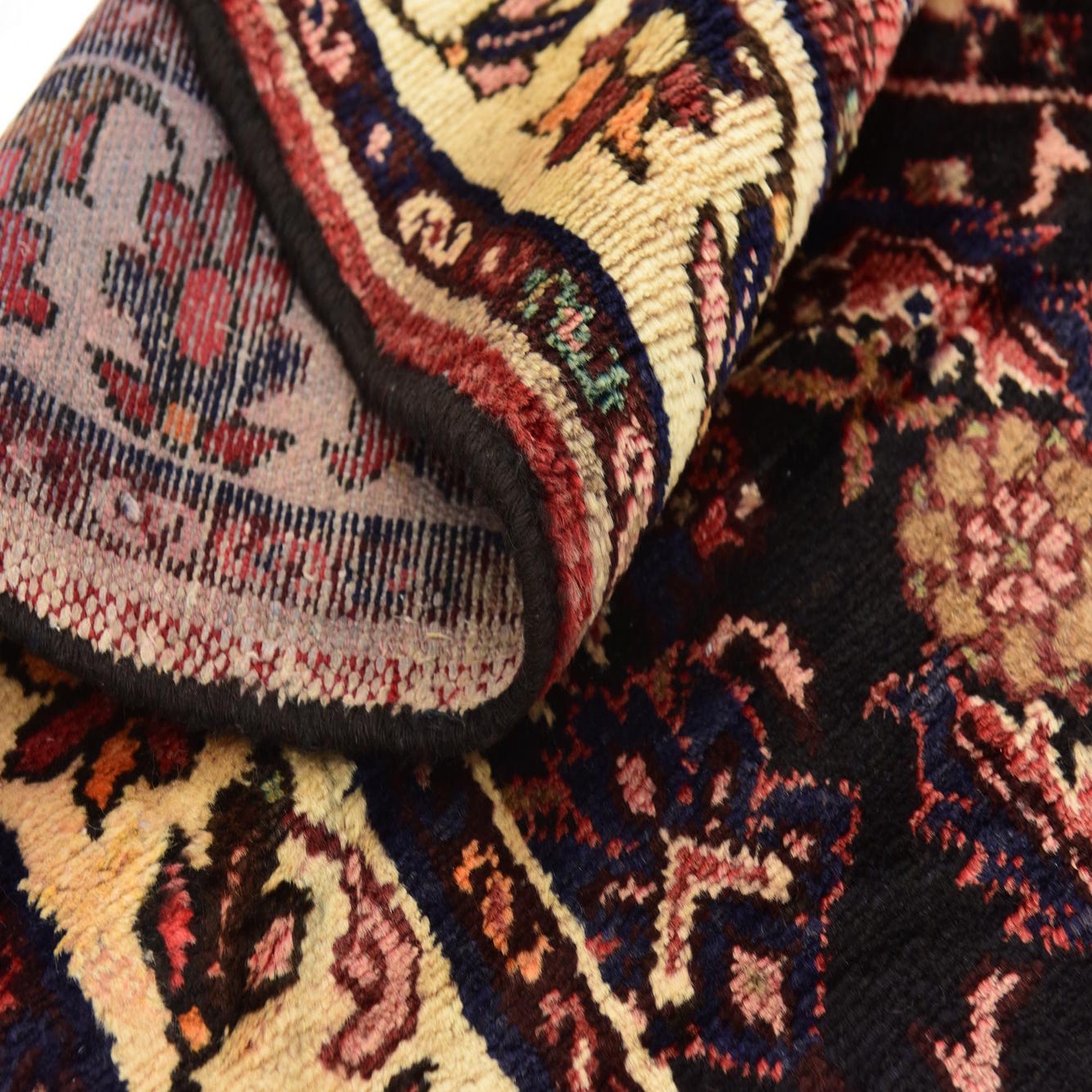 This Hossainabad collection 10-foot runner brings a rich tapestry of color and intricate design to your home decor. Hand-knotted from 100% wool, this rug showcases a deep navy blue background, setting the stage for its detailed pattern work in hues of blue, green, ivory, olive, red, and peach. The harmonious blend of colors is accented by traditional motifs, creating a piece that strikes a balance between sophistication and cultural heritage.