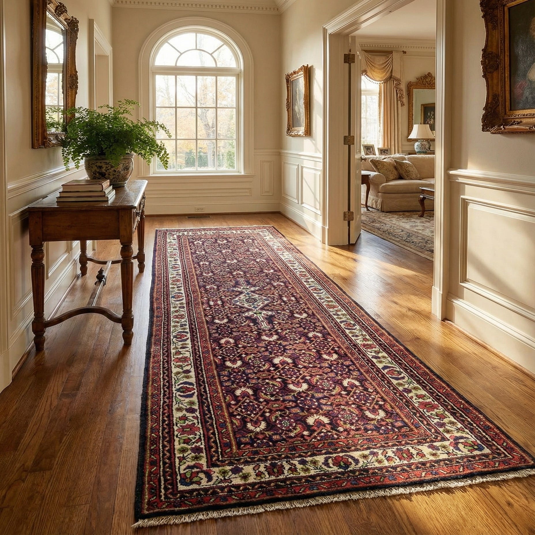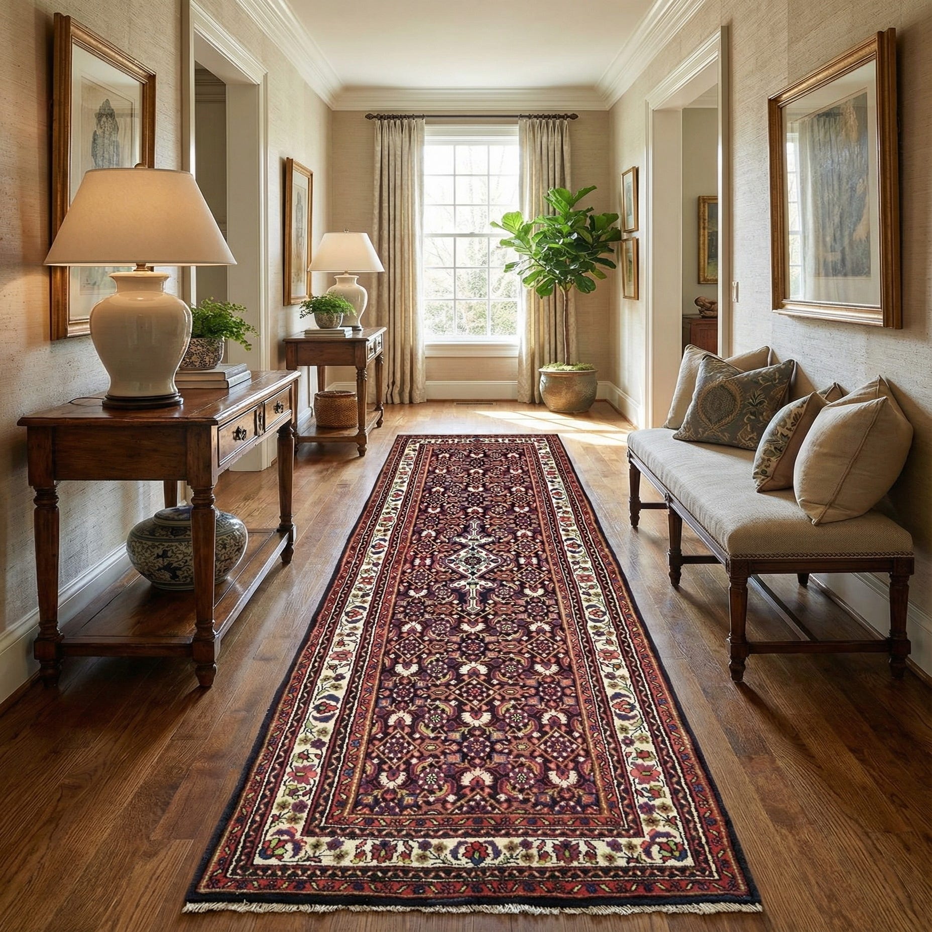 Hand-knotted construction produces a compact, tactile pile that feels soft underfoot and shows crisp detail in each motif. The wool pile has a muted, natural luster that highlights the navy background and the warmer red and peach tones without overpowering a room. Place this runner in a long hallway or entry to anchor circulation, pair it with warm wood floors and brass or aged-metal accents for a classic look, or use it in a transitional kitchen or narrow living area where traditional pattern can add color and structure to simpler furnishings.