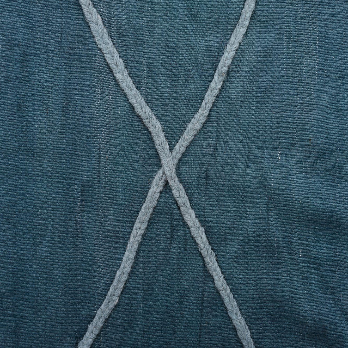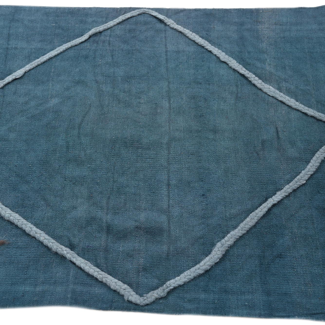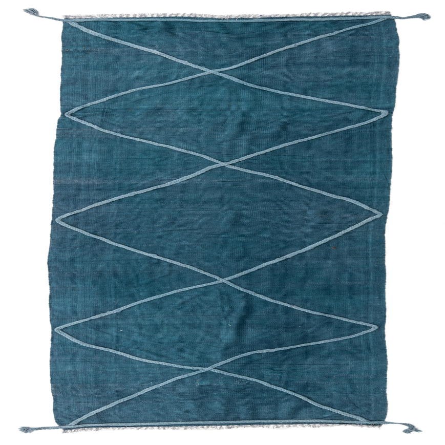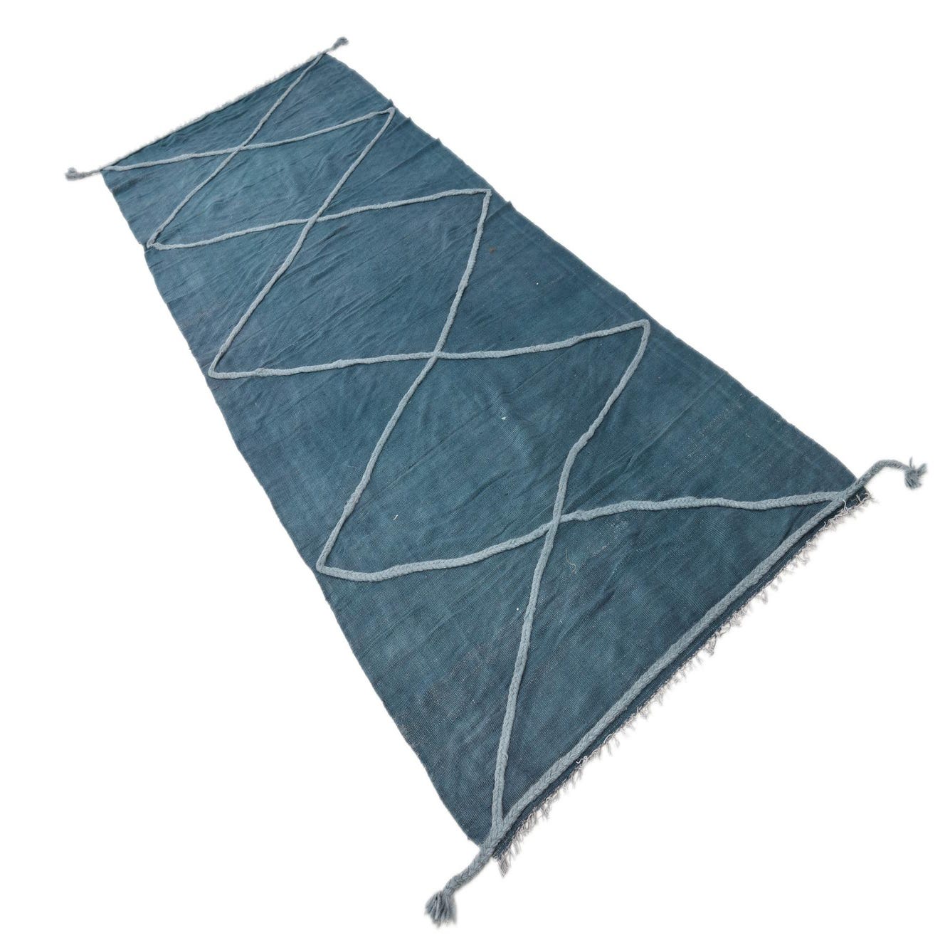 A 10 ft runner rug in deep teal blue, featuring a light blue geometric diamond pattern and braided tassels.